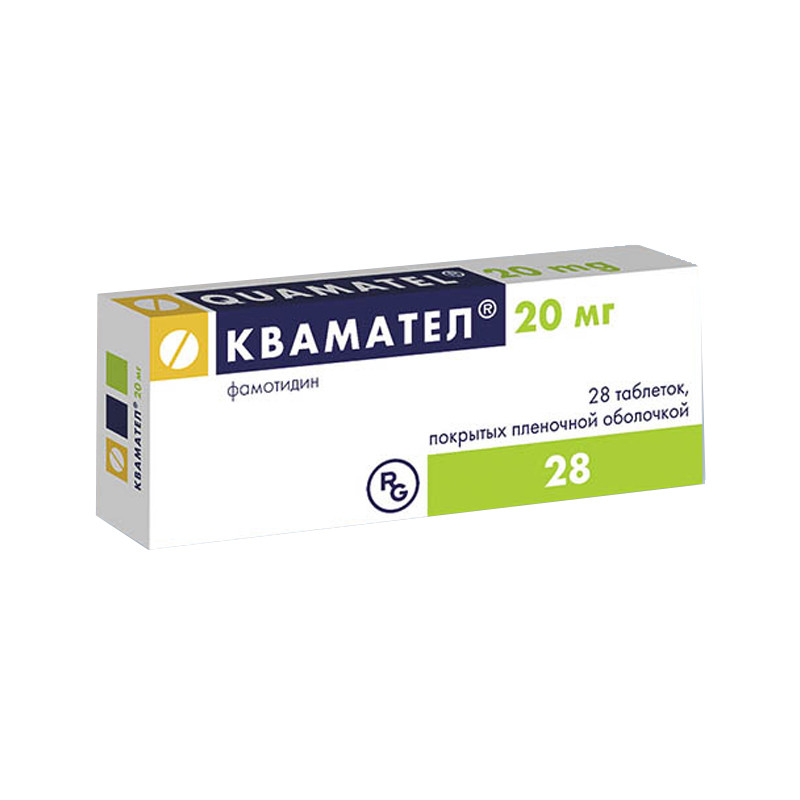 Выпуклые таблетки, покрытые пленочной оболочкой розового (для дозировки 20 мг) или темно-розового (для дозировки 40 мг) цвета, с маркировкой F20 (для дозировки 20 мг) или F40 (для дозировки 40 мг) на одной стороне. | Состав+Одна таблетка содержит фамотидин 20 мг или 40 мг | Противопоказания+- гиперчувствительность к любому компоненту препарата- наследственная непереносимость галактозы, лактазная недостаточность или глюкозо-галактозная мальабсорбция- детский и подростковый возраст до 18 лет- беременность и период лактации (в связи с отсутствием опыта применения) | Побочные действия+Редко (?1/10000 — ‹1/1000)- головная боль, головокружение- диарея, запорОчень редко (‹1/10000)- агранулоцитоз, лейкопения, панцитопения, тромбоцитопения- депрессия, галлюцинации, возбуждение, чувство тревоги, спутанность сознания- аритмия, атриовентрикулярный блок- анорексия, сухость во рту, тошнота, рвота, дискомфорт в брюшной полости- холестатическая желтуха, изменения показателей печеночных ферментов- акне, алопеция, сухость кожи- зуд, утрикарные высыпания, токсический эпидермальный некролиз, отек Квинке, анафилактическая реакция, бронхоспазм- артралгия- мышечные спазмы- невысокая лихорадкаКрайне редко- гинекомастия (обратима при отмене препарата) | Способ применения+Таблетку Кваматела® проглатывают целиком, не разжевывая, запивая стаканом воды, независимо от приема пищи.Лечение язвенной болезни желудка и двенадцатиперстной кишкиРекомендованная доза составляет 40 мг 1 раз в сутки, перед сном или 20 мг 2 раза в сутки (утром и вечером). Длительность лечения составляет 4-8 недель.Профилактика рецидива язвенной болезни желудка и двенадцатиперстной кишкиПрименяют 20 мг 1 раз в сутки, на ночь в течении 4-8 недель.Гастроэзофагеальнорефлюксная болезнь20 мг дважды в день (одну таблетку утром и одну вечером) в течение 6-12 недель. В сучаях, когда ГЭРБ сопровождается эзофагитом пищевода, рекомендованная доза Кваматела® составляет 20-40 мг в течение 12 недель.Синдром Золингера-ЭллисонаНачальная доза обычно составляет 20 мг каждые 6 часов у пациентов, прежде не применявших антисекреторную терапию. Затем доза должна быть скорректирована в зависимости от состояния больного.Пациенты, ранее принимавшие другой H2 -гистаминоблокатор, могут перейти на прием Кваматела® с использованием доз более высоких, чем 20 мг, через каждые 6 часов.Профилактика аспирации желудочного содержимого при проведении общей анестезии: 40 мг вечером накануне операции или утром в день операции.Способ применения и дозы у особых групп пациентовПочечная недостаточностьПоскольку Квамател® в основном экскретируется почками, следует с осторожностью его применять у больных с почечной недостаточностью.В случае если клиренс креатинина ‹30 мл/мин, а уровень сывороточного креатинина ›3 мг/мл, максимальная суточная доза должна быть снижена до 20 мг или увеличен интервал между приемом доз до 36-48 часов.Применение у детейБезопасность и эффективность этого препарата у детей не установлена.Применение у пожилых пациентовКоррекция дозы в зависимости от возраста не требуется. | Показания к применению+- лечение и профилактика рецидивов язвенной болезни желудка и двенадцатиперстной кишки- гастроэзофагеальнорефлюксная болезнь (ГЭРБ)- синдром Золингера-Эллисона- профилактика аспирации желудочного содержимого при проведении общей
