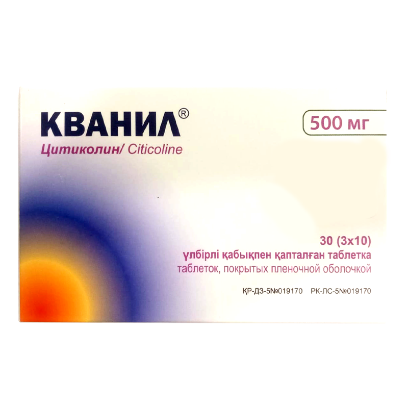 Таблетки, покрытые пленочной оболочкой белого цвета, капсулообразной формы | Состав+Одна таблетка содержитцитиколина натрия 522.50 мг, эквивалентного цитиколину 500 мг | Противопоказания+- Повышенная чувствительность к компонентам препарата;- состояние с высоким тонусом парасимпатической нервной системы (ваготония);- наследственная непереносимость лактозы, дефицит фермента Lapp-лактазы, мальабсорбция глюкозы-галактозы;- детский и подростковый возраст до 18 лет (в связи с отсутствием достаточных клинических данных) | Побочные действия+Очень редко (‹1/10,000) (включая индивидуальные реакции)- аллергические реакции, крапивница, экзантема, покраснение кожи вплоть до пурпурного окрашивания, кожный зуд, отеки, возможно, развитие анафилактического шока;- головная боль, головокружение, галлюцинации, возбуждение, бессонница, повышение температуры, чувство жара, тремор;- диспноэ;- тошнота, рвота, диарея;- повышение или кратковременное понижение артериального давления | Способ применения+Рекомендованная доза составляет от 500 до 2000 мг в сутки (1-4 таблетки).Дозы препарата и срок лечения зависят от тяжести поражений мозга и устанавливаются врачом.Пациенты пожилого возраста не нуждаются в корректировании дозы. | Показания к применению+- Инсульт и его последствия;- черепно-мозговая травма и ее последствия;- когнитивные, чувствительные и двигательные неврологическиерасстройства, вызванные дегенеративными изменениями и сосудистыми нарушениями | МНН: ЦитиколинОбъем: