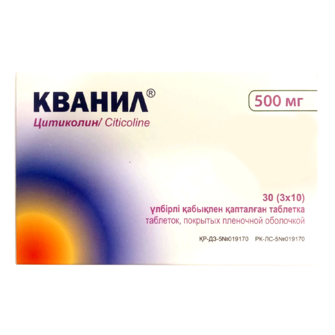 Таблетки, покрытые пленочной оболочкой белого цвета, капсулообразной формы | Состав+Одна таблетка содержитцитиколина натрия 522.50 мг, эквивалентного цитиколину 500 мг | Противопоказания+- Повышенная чувствительность к компонентам препарата;- состояние с высоким тонусом парасимпатической нервной системы (ваготония);- наследственная непереносимость лактозы, дефицит фермента Lapp-лактазы, мальабсорбция глюкозы-галактозы;- детский и подростковый возраст до 18 лет (в связи с отсутствием достаточных клинических данных) | Побочные действия+Очень редко (‹1/10,000) (включая индивидуальные реакции)- аллергические реакции, крапивница, экзантема, покраснение кожи вплоть до пурпурного окрашивания, кожный зуд, отеки, возможно, развитие анафилактического шока;- головная боль, головокружение, галлюцинации, возбуждение, бессонница, повышение температуры, чувство жара, тремор;- диспноэ;- тошнота, рвота, диарея;- повышение или кратковременное понижение артериального давления | Способ применения+Рекомендованная доза составляет от 500 до 2000 мг в сутки (1-4 таблетки).Дозы препарата и срок лечения зависят от тяжести поражений мозга и устанавливаются врачом.Пациенты пожилого возраста не нуждаются в корректировании дозы. | Показания к применению+- Инсульт и его последствия;- черепно-мозговая травма и ее последствия;- когнитивные, чувствительные и двигательные неврологическиерасстройства, вызванные дегенеративными изменениями и сосудистыми нарушениями | МНН: ЦитиколинОбъем: