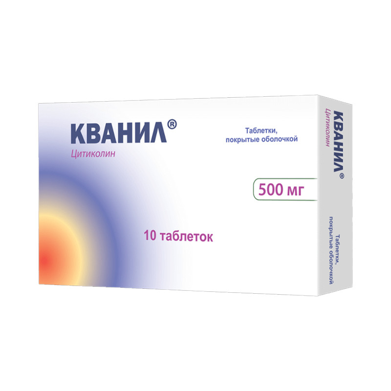 Таблетки, покрытые пленочной оболочкой белого цвета, капсулообразной формы | Состав+Одна таблетка содержитцитиколина натрия 522.50 мг, эквивалентного цитиколину 500 мг | Противопоказания+- Повышенная чувствительность к компонентам препарата;- состояние с высоким тонусом парасимпатической нервной системы (ваготония);- наследственная непереносимость лактозы, дефицит фермента Lapp-лактазы, мальабсорбция глюкозы-галактозы;- детский и подростковый возраст до 18 лет (в связи с отсутствием достаточных клинических данных) | Побочные действия+Очень редко (‹1/10,000) (включая индивидуальные реакции)- аллергические реакции, крапивница, экзантема, покраснение кожи вплоть до пурпурного окрашивания, кожный зуд, отеки, возможно, развитие анафилактического шока;- головная боль, головокружение, галлюцинации, возбуждение, бессонница, повышение температуры, чувство жара, тремор;- диспноэ;- тошнота, рвота, диарея;- повышение или кратковременное понижение артериального давления | Способ применения+Рекомендованная доза составляет от 500 до 2000 мг в сутки (1-4 таблетки).Дозы препарата и срок лечения зависят от тяжести поражений мозга и устанавливаются врачом.Пациенты пожилого возраста не нуждаются в корректировании дозы. | Показания к применению+- Инсульт и его последствия;- черепно-мозговая травма и ее последствия;- когнитивные, чувствительные и двигательные неврологическиерасстройства, вызванные дегенеративными изменениями и сосудистыми нарушениями | МНН: ЦитиколинОбъем: 500 мгАртикул: A02-0023931
