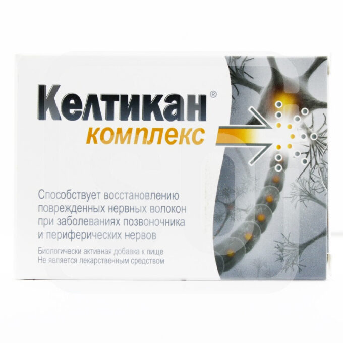 Твердые желатиновые капсулы с непрозрачным корпусом серого цвета и крышечкой синего цвета. Содержимое капсул — белый гигроскопичный порошок. | Состав+Одна капсула содержит: : цитидина -5?-монофосфата динатриевая соль — 5 мгуридина 5?-тринатрий трифосфата, уридина 5?-динатрий дифосфата, уридина 5?-динатрий монофосфата — 3 мг (что соответствует 1,33 мг чистого уридина) | Противопоказания+повышенная чувствительность к препаратудетский возраст до 5 лет | Побочные действия+Не было описано.Возможно проявление аллергических реакций, в случае проявления каких-либо нежелательных явлений, следует приостановить прием и обязательно обратиться к врачу. | Способ применения+Келтикан® капсулы принимают перорально.Взрослые: по 1-2 капсулы 2 раза в сутки.Детям старше 5 лет: по 1 капсуле 2 раза в сутки.Келтикан® можно принимать до или после приема пищи.Рекомендованная продолжительность курса лечения — не менее 10 дней. При необходимости прием капсул может быть продолжен на 20 дней, если врач считает это необходимым. | Показания к применению+- радикулиты (люмбаго, люмбалгия, люмбоишиалгия)- диабетическая полиневропатия- алкогольные полиневриты- опоясывающий лишай, ганглионит- воспаление тройничного нерва, невралгия лицевого, тройничного,межреберных нервов- плекситы. | Артикул: A01-0006398