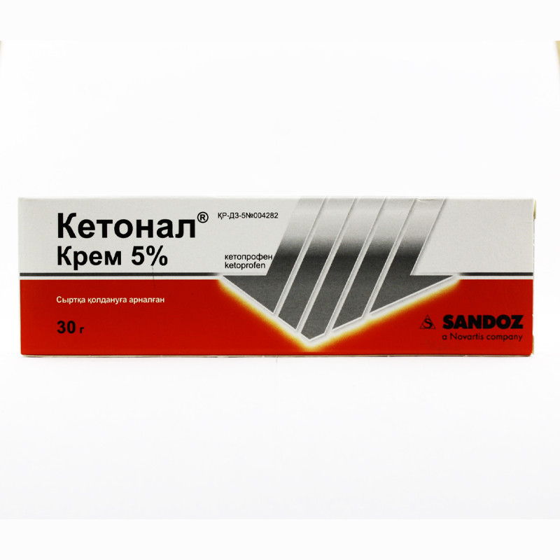 Гомогенный крем от белого до почти белого цвета. | Состав+Один грамм крема содержит кетопрофен 50 мг | Противопоказания+- индивидуальная повышенная чувствительность к кетопрофену и/или другим компонентам крема- индивидуальная повышенная чувствительность к ацетилсалициловой кислоте или другим НПВС (указания в анамнезе на бронхиальную астму, крапивницу или ринит, связанные с приемом ацетилсалициловой кислоты)- экзема, мокнущий дерматит, открытая или инфицированная рана в месте предполагаемого нанесения (крем не должен наноситься на поврежденную кожу)- детский возраст (до 6 лет)- третий триместр беременности- период лактации | Побочные действия+Часто:- зуд, покраснение и транзиторное воспаление кожи легкой степени (контактный дерматит)Редко:- крапивница, фотоаллергическая реакцияОчень редко:- мультиформная эритема, Синдром Стивенса-Джонсона- дерматонекроз | Способ применения+Крем наносят тонким слоем на кожу над очагом поражения и осторожно втирают 2 — 3 раза в сутки.Дозировка должна быть подобрана в соответствии с площадью пораженного участка: 2,5 см крема (2 г) соответствуют 100 мг кетопрофена.Кетонал® крем может применяться в комбинации с другими лекарственными формами Кетонала® (капсулами, таблетками, свечами). Суммарная суточная доза кетопрофена при этом не должна превышать 200 мг.Продолжительность курса лечения не должна превышать 14 дней. | Показания к применению+- острые и хронические воспалительные заболевания опорно-двигательного аппарата- травмы опорно-двигательного аппарата (растяжения связок, разрывы связок и сухожилий мышц, тендинит, ушиб мышц и связок)- посттравматический болевой синдром | МНН: КетопрофенОбъем: 5%Артикул: A02-0000558