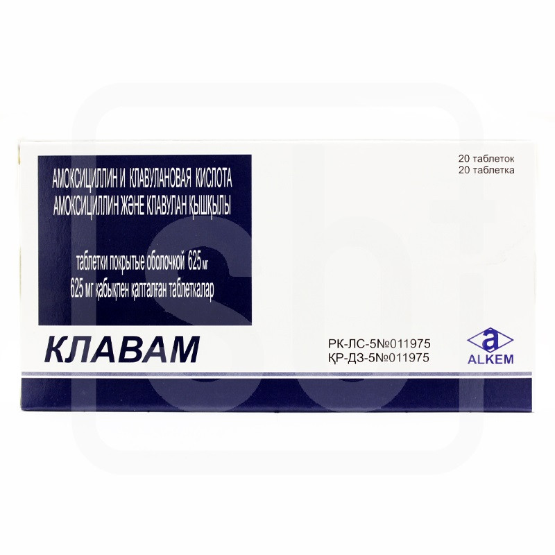 Таблетки, покрытые оболочкой белого цвета, двояковыпуклой овальной формы с риской с двух сторон. | Состав+Одна таблетка, покрытая оболочкой, содержитамоксициллина тригидрата 294 .12 мг и 588.24 мг (эквивалентного амоксициллину 250 мг и 500 мг)калия клавуланата в смеси в авицелом (1 : 1) 305 мг(эквивалентного кислоте клавулановой 125 мг) | Противопоказания+- повышенная чувствительность к антибиотикам группы пенициллинов ванамнезе- повышенная чувствительность к амоксициллину или клавулановой кислоте или другим компонентам препарата- инфекционный мононуклеоз- лимфолейкоз- печеночная недостаточность- холестатическая желтуха или гепатит, вызванные приемом антибиотиков группы пенициллинов в анамнезе- бронхиальная астма, сенный поллиноз- детский возраст до 12 лет | Побочные действия+Возможны- потеря аппетита, тошнота, рвота, диарея, изменение окраски зубной эмали Редко- псевдомембранозный колит с тяжелой диарей- эритема, кожная сыпь, зуд; у предрасположенных пациентов — реакции гиперчувствительности немедленного типа (ангионевротический отек, бронхоспазм, анафилактический шок)- развитие суперинфекции (стоматит, вагинит, дисбактериоз, кандидоз)- бессонница, возбуждение, головокружение, спутанность сознание, судорожные реакции- боли в суставах- интерстициальный нефрит, кристаллурия, лейкопения, тромбоцитопения- тахикардияВ единичных случаях- транзиторное повышение активности печеночных ферментов, холестатическая желтуха, гепатит, нарушения функции печени | Способ применения+Взрослым и детям старше 12 лет (или c массой тела более 40 кг) при легком или среднетяжелом течении инфекции назначают по 1 таблетке 375 мг каждые 8 ч или по 1 таблетке 625 мг каждые 12 ч, в случае тяжелого течения инфекции и инфекций дыхательных путей — по 1 таблетке 625 мг каждые 8 ч.Максимальная суточная доза для амоксициллина составляет 6 г для взрослых и 45 мг/кг массы тела для детей; для клавулановой кислоты — 600 мг для взрослых и 10 мг/кг для детей.Курс лечения составляет 5-14 дней. Продолжительность курса лечения определяется лечащим врачом. Лечение не должно продолжаться более 14 дней без повторного медицинского осмотра.При одонтогенных инфекциях назначают по 1 таблетке 375 мг каждые 8 ч или 1 таблетке 625 мг каждые 12 ч в течение 5 дней.При почечной недостаточности умеренной степени (КК 10-30 мл/мин) назначают по 1 таблетке 625 мг каждые 12 ч, при почечной недостаточности тяжелой степени (КК менее 10 мл/мин) — по 1 таблетке 625 мг каждые 24 ч. При анурии интервал между приемами доз следует увеличить до 48 ч и более. | Показания к применению+Инфекционно-воспалительные заболевания, вызванные чувствительными к препарату микроорганизмами:инфекции верхних отделов дыхательных путей (в т.ч. острый и хронический синусит, заглоточный абсцесс, тонзиллит, фарингит)инфекции нижних отделов дыхательных путей (в т.ч. острый и хронический бронхит с бактериальной суперинфекцией, пневмония)острый и хронический отитинфекции мочевыводящих путейгинекологические инфекцииинфекции кожи и мягких тканейинфекции костей и суставовинфекции желчных путей (холецистит, холангит)шанкроидгонореяодонтогенные инфекции. | Объем: 625 мгАртикул: A02-0024158