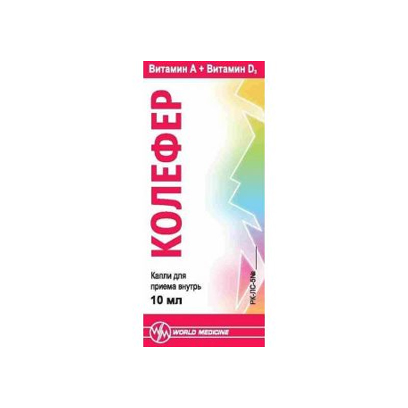 Однородный раствор от светло-желтого до желтоватого цвета. | Состав+1 мл раствора содержитвитамин А (ретинола пальмитат) 11.236 мг (20000 МЕ)витамин Д3 (холекальциферол) 0.250 мг (10000 МЕ) | Противопоказания+-Гиперчувствительность к ретинолу и холекальциферолу или другим компонентам препарата;- гипервитаминоз витаминов А и/или Д;- почечная недостаточность;- гиперкалиемия;- мальабсорбция;- детский возраст до 4 месяцев | Побочные действия+Параметры частоты побочных эффектов определены следующим образом: неуточненной частоты — параметры частоты не могут быть оценены по имеющимся данным.Со стороны центральной нервной системы:- головная боль, головокружение, нервозность, депрессия, психические расстройстваСо стороны пищеварительной системы:- потеря аппетита, тошнота, рвота, сухость во рту, боли в животе, кишечная непроходимость.Со стороны мочеполовой системы:- полиурия, камни в почках, повышение уровня кальция в моче.Со стороны кровеносной системы:- повышение уровня кальция в крови, анемия.Со стороны опорно-двигательного аппарата и соединительной ткани:- боль в мышцах, артралгия, отек соединительной ткани, боль в костях.Со стороны кожи и подкожно-жировой клетчатки:- герпетическая лихорадка, выпадение волос, сухость кожи.Прочие:- потеря веса, кальцификация тканей | Способ применения+Колефер принимают внутрь после еды в ложке жидкости:- дети в возрасте от 4 месяцев до 12 месяцев: по 2 капли в сутки;- дети в возрасте от 1 года до 18 лет: по 3 капли в сутки;- взрослые: по 3 капли 2 раза в сутки | Показания к применению+Профилактикарахит у новорожденных и детей грудного возрастагиповитаминоз и авитаминоз витаминов А и Д у детей грудного и старшего возрастав комплексной терапии у детей и взрослых при заболеваниях кожи и слизистых (псориаз, ихтиоз, дерматозы) | Объем: