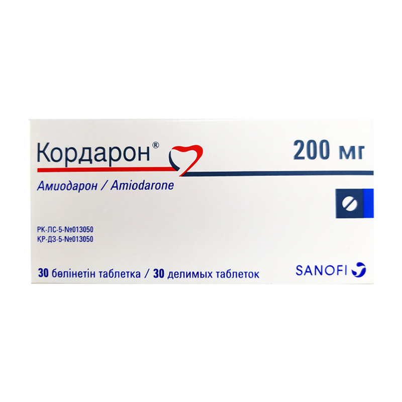 Круглые делимые таблетки от белого до слегка кремового цвета с гравировкой: символ в виде сердца и «200» на одной из сторон | Состав+амиодарона гидрохлорид 200 мг | Противопоказания+- синусовая брадикардия и синоатриальная блокада сердца, за исключением случаевкоррекции водителем ритма- синдром слабости синусового узла, за исключением случаев коррекции водителемритма (опасность остановки синусового узла)- тяжелые нарушения проводимости, при отсутствии коррекции водителем ритма- гипертиреоз- повышенная чувствительность к йоду, амиодарону или одному извспомогательных веществ- беременность и период лактации- врожденная галактоземия- синдром мальабсорбции глюкозы и галактозы- дефицит лактазы- сочетание с препаратами, способными вызывать пируэтную тахикардию: антиаритмические препараты Iа класса (хинидин, гидрохинидин, дизопирамид), антиаритмические препараты III класса (соталол, дофетилид, ибутилид), сультоприд, бепридил, цисаприд, дифеманил, мизоластин, винкамин, эритромицин, моксифлоксацин, спирамицин для внутривенного введения. | Побочные действия+Очень часто ( 10%); часто ( 1%, 10%); иногда ( 0,1%, 1%); редко ( 0,01%, 0,1%); очень редко ( 0,01%).Очень часто- тошнота, рвота, дисгевзия- микроотложения на сетчатке- фотосенсибилизация- повышение уровня тироксина (Т4) при нормальном или слегка сниженном уровне трийодтиронина (Т3)- изолированное и обычно умеренное повышение трансаминазЧасто- острая гепатопатия с повышенным уровнем трансаминаз в сыворотке и/илижелтухой- гипотиреоз- гипертиреоз- альвеолярный/интерстициальный пневмонит и облитерирующий бронхиолит спневмонией, плеврит- сероватая или голубоватая пигментация кожи- экстрапирамидный тремор- нарушения сна, в том числе кошмарные сновидения- сенсорные, моторные или смешанные периферические нейропатии- умеренная брадикардия.Иногда- синоатриальная блокада, атриовентрикулярная блокада различных степеней)- периферические сенсомоторные нейропатии и/или миопатииОчень редко- снижение остроты зрения и отек глазного дна, неврит зрительного нерва- эритема, кожная сыпь, эксфолиативный дерматит, выпадение волос- бронхоспазм, особенно у больных бронхиальной астмой- синдром острого респираторного дистресса взрослых, чаще всего — сразу послехирургического вмешательства (возможна несовместимость с высокойконцентрацией кислорода)- мозжечковая атаксия- доброкачественная внутричерепная гипертензия, головные боли- хронические заболевания печени при длительном лечении- выраженная брадикардия или в исключительных случаях — синусовая остановкасердца- эпидидимит- васкулит- дисфункция почек с умеренным повышением уровня креатинина- тромбоцитопения. | Способ применения+Начальное лечениеНачальный режим дозирования — 3 таблетки в сутки, в течение 8-10 дней. В некоторых случаях в начале лечения могут применяться более высокие дозы (4 или 5 таблеток в сутки), но только в течение короткого времени и при электрокардиографическом контроле.Поддерживающее лечениеСледует определить минимальную эффективную дозу; в соответствии с индивидуальным ответом, она может находиться в пределах от ? таблетки в сутки (по одной таблетке через день) до 2 таблеток в сутки. | Показания к применению+- профилактика рецидивов:- желудочковой тахикардии, представляющей опасность для жизни: лечение должно быть начато в стацион