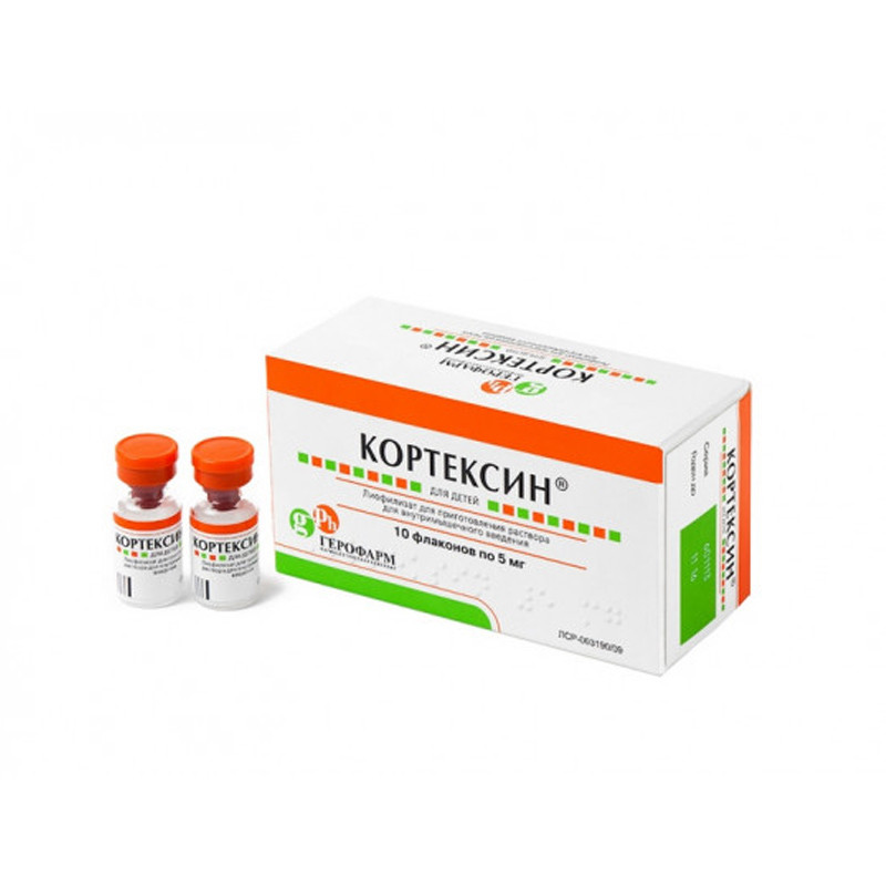 Лиофилизированный порошок или пористая масса белого или белого с желтоватым оттенком цвета. | Состав+кортексин (комплекс водорастворимых полипептидных фракций с молекулярной массой не более 10 000 Да) 5мг | Противопоказания+- индивидуальная непереносимость компонентов препарата | Побочные действия+- возможна индивидуальная гиперчувствительность к компонентам препарата | Способ применения+Препарат вводят внутримышечно.Содержимое флакона перед инъекцией растворяют в 1-2 мл 0,5 % раствора прокаина (новокаина), воды для инъекций или 0,9 % раствора натрия хлорида и вводят однократно ежедневно: детям c периода новорожденности, при массе тела до 20 кг в дозе 0,5 мг/кг, с массой тела более 20 кг — в дозе 10 мг в течение 10 дней.При необходимости проводят повторный курс через 3-6 месяцев. | Показания к применению+В составе комплексной терапии:- нарушений мозгового кровообращения- черепно-мозговой травмы и ее последствий- энцефалопатий различного генеза- когнитивных нарушений (расстройства памяти и мышления)- острых и хронических энцефалитов и энцефаломиелитов- эпилепсии- астенических состояний (надсегментарные вегетативные расстройства)- сниженной способности к обучению- задержки психомоторного и речевого развития у детей- различных форм детского церебрального паралича | Артикул: A02-0023342