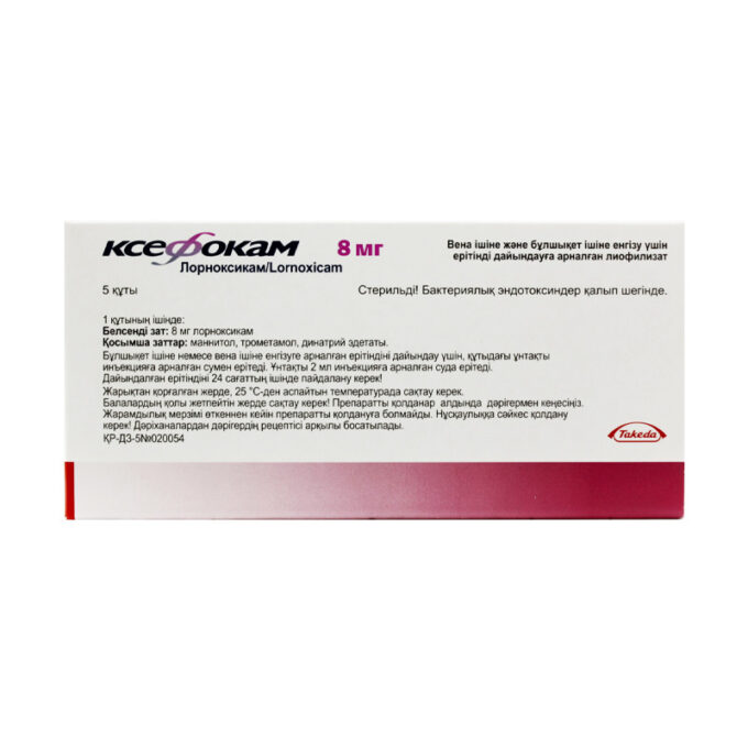 Лиофилизированный порошок в виде желтой плотной массы | Состав+лорноксикам, 8 мг | Противопоказания+повышенная чувствительность к лорноксикаму, ацетилсалициловой кислоте или другим НПВПгеморрагический диатез, нарушение свертывания крови, гематологические нарушения неясной этиологиилицам, перенесшим операции, сопряженные с риском кровотечения или неполного гемостазаязвенная болезнь желудка и двенедцатиперстной кишки в фазе обострениявыраженные нарушения функции печенитяжелые нарушения функции почек (уровень сывороточного креатинина › 300 мкмоль/л)обезвоживаниеподтвержденный или предполагаемый диагноз цереброваскулярного кровотечениядетский и юношеский возраст до 18 летбеременность и лактация. | Побочные действия+боль в животе, диспепсия, тошнота, рвота, диарея, запоры, дисфагия, сухость во рту, метеоризм, гастрит, гастроэзофагеальный рефлюкс, пептические язвы, желудочно-кишечные кровотеченияголовокружение, головная боль, бессонница, сонливость, недомогание, слабость, повышенная потливость, приливы, парестезия, тремор, судороги ног, нарушения вкусааллергические реакции, дерматиты, сыпьлейкоцитопения, тромбоцитопения, увеличение времени кровотечения, анемия, снижение уровня эритроцитов, гемоглобинатахикардия, гипотензия, гипертензиякашель, одышка, бронхоспазминтерстициальный нефрит, нефротический синдром, увеличение уровней азота мочевины и креатинина в крови, нарушение мочеиспусканияувеличение уровней трансаминаз, уровня щелочной фосфотазы, нарушения функции печенимиалгияконъюнктивиты, нарушения зрения. | Способ применения+Раствор для инъекций готовят непосредственно перед использованием путем растворения содержимого флакона (8 мг порошка Ксефокам) водой для инъекций (2 мл).После приготовления раствора иглу заменяют. Внутримышечные инъекции делают длинной иглой.Продолжительность внутривенного введения раствора должна составлять не менее 15 секунд, внутримышечного — не менее 5 секунд.Начальная доза может составлять 8 или 16 мг.Поддерживающая терапия: по 8 мг два раза в сутки.Максимальная суточная доза не должна быть более 16 мг.Внутрисуставное введение Ксефокама при артритах 8 мг.Длительность и кратность терапии зависит от тяжести заболевания и устанавливается индивидуально. | Показания к применению+умеренный и выраженный болевой синдром различной этиологиисимптоматическое лечение боли и воспаления при воспалительных и дегенеративных ревматических заболеваниях. | МНН: ЛорноксикамОбъем: 8 мгАртикул: A02-0001396
