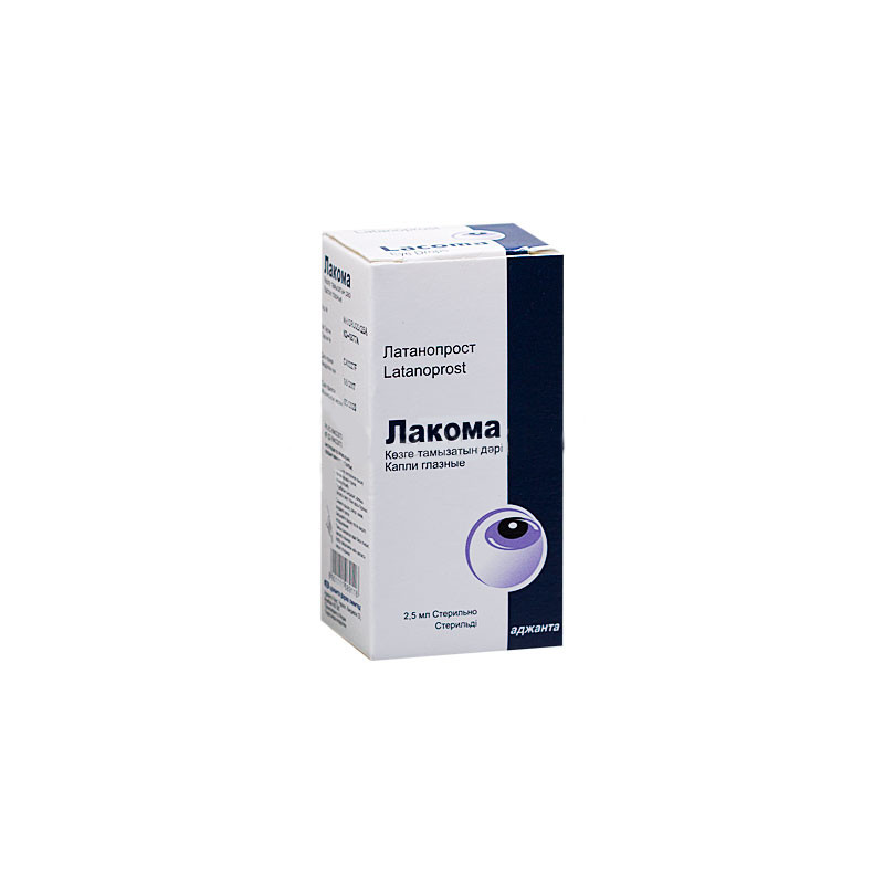 Прозрачный бесцветный раствор, без твердых частиц. | Состав+1 мл раствора содержитлатанопрост — 0,05 мг | Противопоказания+- Повышенная чувствительность к латанопросту или любому другому компоненту препарата- заболевания верхних дыхательных путей, бронхоспазм- беременность и период лактации | Побочные действия+- Раздражение глаз (жжение, зернистость, зуд, ощущение покалывания и инородного тела), блефарит, гиперемия конъюнктивы, боль в глазах, повышенная пигментация радужной оболочки (См. раздел «Особые указания»), временные точечные эпителиальные эрозии, отек век- кожная сыпь- головокружение, головная боль- отек роговицы и эрозии; конъюнктивит; изменения роста ресниц и пушкового волоса (увеличение длины, толщины, пигментации и числа); воспаление радужной оболочки глаза/ увеит; кератит; макулярный отек, включая кистозный макулярный отек; рост ресниц в неправильном направлении, иногда приводящий к раздражению глаза; затуманенное зрение, светобоязнь, периорбитальные изменения, приводящие к образованию бороздок на веках (См. раздел «Особые указания»)- астма (в том числе острые приступы или обострение заболевания у пациентов с бронхиальной астмой в анамнезе), одышка- потемнение кожи век и местные кожные реакции на веках- боли в мышцах/суставах- атипичная боль в груди- герпетический кератит- нестабильная стенокардия, сердцебиение | Способ применения+Взрослые (включая пожилых больных)По одной капле в пораженный глаз один раз в сутки.Оптимальный эффект достигается при применении Лакомы вечером.Частота применения препарата не должна превышать одного раза в сутки, поскольку установлено, что при более частом применении эффективность препарата снижается.Если была пропущена одна доза, то в дальнейшем следует продолжать лечение, вводя следующую дозу как обычно.Препарат может применяться одновременно с другими глазными капелями для снижения ВГД. Если используется более одного местного офтальмологического раствора, лекарства следует принимать, по меньшей мере, с разницей в пять минут.Контактные линзы следует удалять перед применением глазных капель, и могут быть заново надеты через пятнадцать минут. (См. раздел «Особые указания»).ДетиПрепарат применяют в той же дозировке, как и взрослым.Данные по эффективности препарата у недоношенных детей (гестационный возраст менее 36 недель) отсутствуют, у младенцев младше 1 года ограничены. | Показания к применению+- Снижение повышенного внутриглазного давления у пациентов с открытоугольной глаукомой, хронической закрытоугольной глаукомой и с глазной гипертензией- снижение повышенного внутриглазного давления у детей с повышенным внутриглазным давлением и глаукомой | МНН: ЛатанопростОбъем: