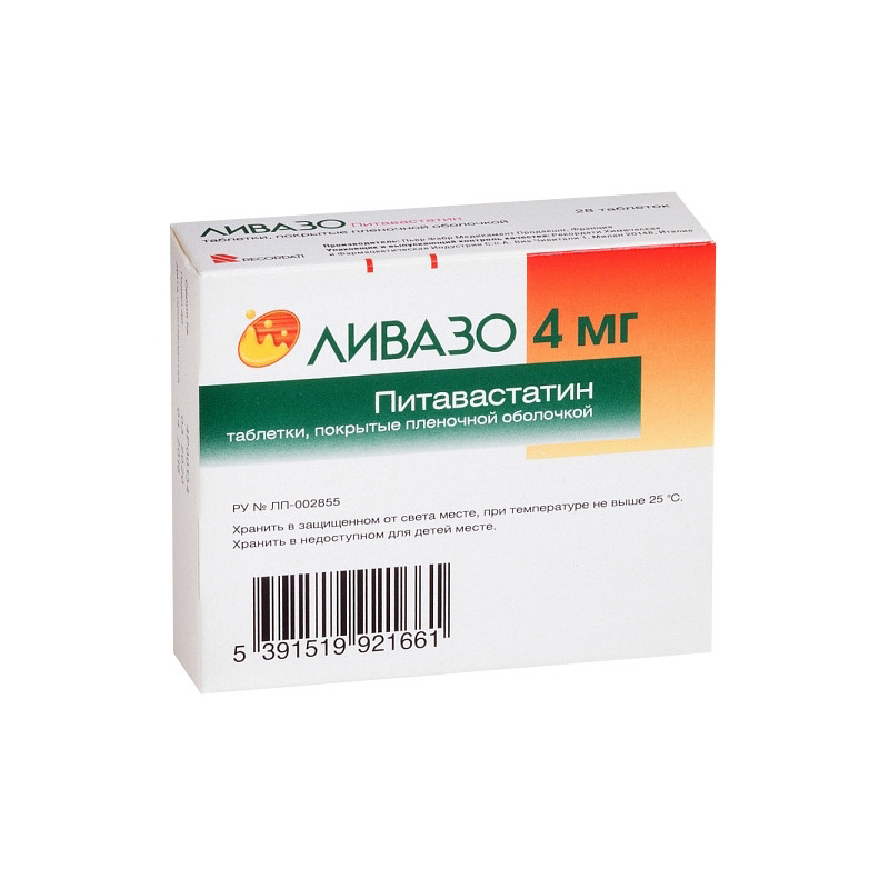 Таблетки, покрытые пленочной оболочкой белого цвета, круглой формы, с маркировкой «КС» на одной стороне и «1» на другой стороне (для дозировки 1 мг)Таблетки, покрытые пленочной оболочкой белого цвета, круглой формы, с маркировкой «КС» на одной стороне и «2» на другой стороне (для дозировки 2 мг)Таблетки, покрытые пленочной оболочкой белого цвета, круглой формы, с маркировкой «КС» на одной стороне и «4» на другой стороне (для дозировки 4 мг) | Состав+Одна таблетка содержитпитавастатин кальция 1.045 мг эквивалентно питавастатину 1.0 мгпитавастатин кальция 2.090 мг эквивалентно питавастатину 2.0 мгпитавастатин кальция 4.180 мг эквивалентно питавастатину 4.0 мг | Противопоказания+- повышенная чувствительность к компонентам препарата и другим статинам- активные заболевания печени, устойчивое повышение трансаминазы сыворотки неизвестной этиологии (в 3 раза превышающим верхнюю границу нормы)- миопатия- одновременный прием циклоспорина- беременность и период лактации- женщины детородного возраста, не принимающие соответствующие контрацептивные средства- детский и подростковый возраст до 18 лет- наследственный синдром непереносимости галактозы, синдром мальабсорбции | Побочные действия+Частота определена как: очень часто (больше или равно 1/10), часто (больше или равно 1/100 до ‹1/10), нечасто (больше или равно 1/1000 до ‹1/100), редко (больше или равно 1/10000 до ‹1/1000) очень редко (‹1/10000) и неизвестно.Часто:- головная боль- запор, диарея, расстройство пищеварения, тошнота- миалгия, боль в суставахНечасто:- анемия- анорексия- бессонница- головокружение, притупление вкусовых ощущений, сонливость- звон в ушах- боль в животе, сухость во рту, рвота- повышение трансаминаз (аспартат-аминотрансфераза, аланиновая аминотрансфераза)- кожный зуд, сыпь- мышечные спазмы- поллакиурия, астения, недомогание, слабость- периферические отекиРедко:- снижение остроты зрения- синдром жжения рта, острый панкреатит- холестатическая желтуха, нарушение функции печени, нарушение со стороны печени- миопатия, рабдомиолиз- крапивница, эритемаСледующие побочные эффекты были выявлены при применении некоторых статинов:- нарушение сна, включая кошмары- потеря памяти- сексуальная дисфункция- депрессия- единичные случаи интерстициального заболевания легких, особенно при длительной терапии. | Способ применения+Для перорального приема. Таблетку не следует разжевывать.Ливазо можно принимать в любое время суток, независимо от приема пищи. Желательно, чтобы пациент принимал таблетку в одно и то же время ежедневно. Терапия статинами, как правило, является более эффективной вечером в связи с циркадным ритмом липидного обмена. Пациенты должны находиться на диете со сниженным содержанием холестерина до начала лечения. Важно, чтобы пациенты продолжали соблюдать диету во время лечения.Обычная начальная доза составляет 1 мг 1 раз в сутки. Коррекцию дозы необходимо проводить с интервалом в 4 недели или более. Дозы следует подбирать индивидуально согласно уровню ЛПНП-Х, схеме терапии и состоянию пациента. Для большинства пациентов оптимальным является доза 2 мг 1 раз в сутки.Максимальная суточная доза составляет 4 мг. | Показания к применению+- первичная гиперхолестеринемия (для снижения повышенного содержания холестерина и холестерина липопротеинов низкой плотности, включая гетерозиготную наследстве