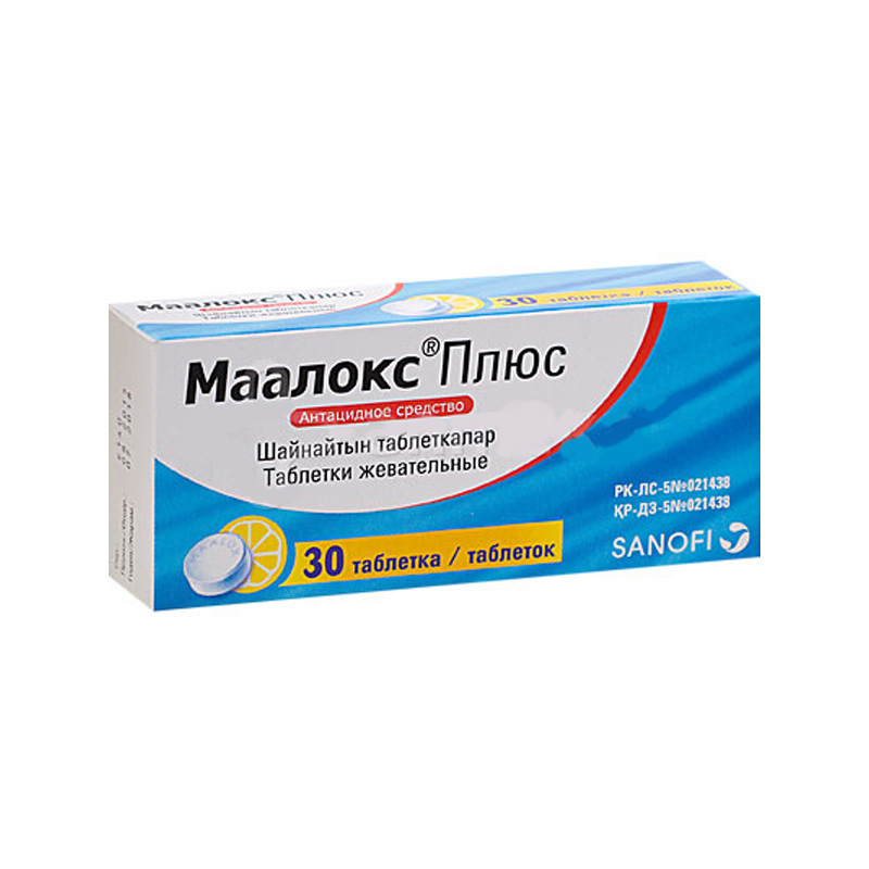 Двухслойные жевательные таблетки белого/желтого цвета с гравировкой «Maalox» на одной стороне. | Состав+Одна таблетка содержитмагния гидроксид 200,0 мг, алюминия гидроксид 200,0 мг, диметикон (эквивалентно симетикону* 26.25 мг) 25,0 мг*- не включая допустимый избыток; | Противопоказания+- сильно ослабленные больные и пациенты с почечной недостаточностью- наследственные нарушения толерантности к фруктозе, синдром мальабсорбции глюкозы-галактозы, недостаточность сахаразы-изомальтазы- повышенная чувствительность к какому-либо из компонентов препарата | Побочные действия+Нечасто (от больше или равно 1/10000 до меньше 1/1000):диарея, запорЧастота неизвестна (невозможно оценить по имеющимся данным):реакции гиперчувствительности (зуд, крапивница, агионевротический отек, анафилактические реакции), гипермагниемия, гипералюминиемия, гипофосфатемия (при длительном приеме высоких доз или обычных доз у пациентов на низкофосфатной диете), что может привести к усилению костной резорбции, гиперкальциурии и остеомаляции. | Способ применения+Для приема внутрь.Взрослые (включая пожилых): По 1-2 таблетки 4 раза в сутки. Хорошо разжевать. Принимать спустя 20 минут-1 час после еды и перед сном (или по потребности).Дети: не рекомендуется. | Показания к применению+Симптоматическая терапия:- диспепсии (cиндром диспепсии определяется как ощущение боли или дискомфорта в области желудка, тяжесть, переполнение, раннее насыщение, тошнота).- изжоги- кислой отрыжки- метеоризма (вздутие живота, повышенное газообразование в кишечнике) | Объем: Таблетки жевательныеАртикул: A01-0004186