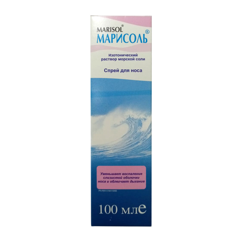 Марисоль изотонический — изотонический раствор морской соли. Восстанавливает естественную влажность носа, способствует к самоочищению, защищает от сухости и механического раздражения (дым, пыль, грязь и т.д.) Регулярное впрыскивание Марисоля изотонического уменьшает возможность инфекции верхних дыхательных путей. | Состав+1мл спрея содержит 9 мг морской соли.Растворитель: очищенная водаКонсервант: бензалконий хлорид 0,1 мг/мл | Противопоказания+Индивидуальная непереносимость. | Побочные действия+При соблюдении условий рекомендованного использования изотонического спрея Marisol не вызывает никаких побочных эффектов. В редких случаях у чувствительных людей возможны аллергические реакции, реакция слабая и исчезает после отмены.В случае аллергической реакции:В редких случаях у чувствительных людей возможны аллергические реакции, реакция слабая и исчезает после отмены. | Способ применения+Детям с 6 месяцев до 7 лет: по 2 вспрыскивания в каждый носовой ход 4 раза в день.Взрослым и детям с 7 лет: 2-3 впрыскивания в каждый носовой ход 4-8 раз в день.Перед первым использованием снимите защитное кольцо пластикового колпачка- распылителя. Держите флакон вертикально. Снимите защитный колпачок и нажмите несколько раз на дозатор, пока не появится первая капля. Вставьте кончик спрея в ноздрю и нажмите на механизм дозатора. Во время впрыскивания осторожно дышите носом.После закапывания покачайте голову в разные стороны.После использования, промойте наконечник дозатора чистой водой. Наденьте защитный колпачок на место. | Показания к применению+- Для ежедневной гигиены носа;- для пациентов с нарушениями работы дыхательных путей, простудой, вызванный вирусом и насморком аллергического происхождения;- при сухой и раздраженной слизистой оболочки носа, физиологические функции которые нарушены;- для людей, у которых слизистая оболочка носа подвержена пересыханию в помещениях с центральным отоплением и кондиционированием помещения;- непосредственно перед использованием капель для носа, для промывания носовой полости и обеспечения лучшего контакта препарата со слизистой оболочкой носа | Объем: