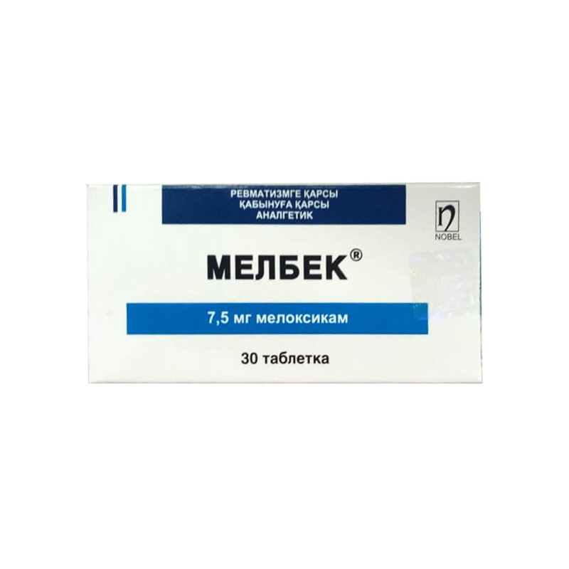 Круглые таблетки светло-желтого цвета, с риской на одной стороне. | Состав+Одна таблетка содержитмелоксикама 7,5 мг | Противопоказания+- повышенная чувствительность к мелоксикаму или к любому компоненту препарата- наличие в анамнезе бронхиальной астмы, полипоза слизистой носа, конъюнктивита, ангионевротического отека или кожных высыпаний, вызванныхприемом ацетилсалициловой кислоты или других НПВС- язвенная болезнь желудка и двенадцатиперстной кишки в фазе обострения- желудочно-кишечное кровотечение, цереброваскулярные кровотечения или другие геморрагические заболевания- воспалительные заболевания кишечника в фазе обострения, болезнь Крона, неспецифический язвенный колит- болевой синдром после аорто-коронарного шунтирования- выраженная сердечная недостаточность- тяжелая печеночная и почечная недостаточность- детский и подростковый возраст до 15 лет- беременность и период лактации | Побочные действия+- диспепсия, отрыжка, тошнота, рвота, боли в животе, запор, диарея, метеоризм, эзофагит, стоматит, гастрит- эрозивно-язвенные поражения желудочно-кишечного тракта, скрытые или явные желудочно-кишечные кровотечения, колит- преходящие изменения активности трансаминаз, уровня билирубина идругих показателей функции печени, гепатит- анемия, изменение лейкоцитарной формулы, лейкопения и тромбоцитопения,миелодепрессивное действие- острое нарушение бронхиальной проходимости, бронхиальная астма (у предрасположенных пациентов)- головные боли, головокружение, звон в ушах, потемнение в глазах, сонливость, спутанность сознания, нарушение ориентации, изменение настроения- отеки, повышение артериального давления, сердцебиение, «приливы» к лицу- изменение показателей функции почек (повышение креатинина и/илимочевины сыворотки крови), острая почечная недостаточность, нефрит- зуд, кожная сыпь, крапивница, фотосенсибилизация, буллезные высыпания, мультиформная эритема, синдром Стивенса-Джонсона, токсический эпидермальный некролиз, ангионевротический отек, реакции гиперчувствительности немедленного типа (в т.ч. анафилактические и анафилактоидные)- конъюнктивит, нарушения зрения (в т.ч. нечеткость зрения). | Способ применения+Таблетки следует принимать во время еды, запивая водой.МЕЛБЕК® можно назначать только взрослым или подросткам старше 15 лет.Остеоартроз: 7,5мг в сутки, при необходимости дозу можно повышать до 15мг.Ревматоидный артрит: 15мг в сутки, в зависимости от терапевтического эффекта, суточную дозу можно снижать до 7,5мг.Анкилозирующий спондилит: 15мг в сутки, суточную дозу можно снижать до 7,5мг.При болевом синдроме различной этиологии прием препарата следует начать с 7,5мг в сутки, при необходимости можно увеличить дозу до 15 мг.Максимальная суточная доза не должна превышать 15мг.Рекомендуемая доза для подростков старше 15 лет составляет 0,25мг/кг веса тела.Для пациентов с тяжелой почечной недостаточностью, при гемодиализе доза не должна превышать 7,5мг в сутки.Длительность лечения назначается лечащим врачом индивидуально. | Показания к применению+- симптоматическое лечение ревматических заболеваний: ревматоидный артрит,анкилозирующий спондилит (болезнь Бехтерева), реактивные артриты- остеоартроз и другие дегенеративные заболевания суставов и позвоночника, сопровождающиеся болевым синдромом- болевой синдром различной