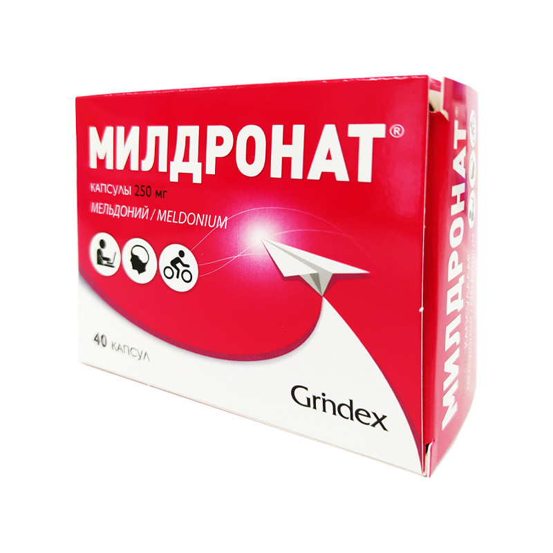 Твердые желатиновые капсулы белого цвета. Твердые желатиновые капсулы № 00 белого цвета. Содержимое — белый кристаллический порошок со слабым запахом. Порошок гигроскопичен. | Состав+Одна капсула содержит- мельдоний 500 мг и 250 мг | Противопоказания+- Повышенная чувствительность к активному веществу или к какому либо вспомогательному веществу препарата- Повышение внутричерепного давления (при нарушении венозного оттока, внутричерепных опухолях)- Беременность и лактация, ввиду отсутствия данных о клиническом применении препарата в этот период- Детский и подростковый возраст до 18 лет, ввиду отсутствия данных о клиническом применении препарата в этот период | Побочные действия+Редко- аллергические реакции (покраснение, высыпания, зуд, отек)- диспептические явления- тахикардия- колебания артериального давления- возбуждение- головные боли- чувство дискомфорта в эпигастрии | Способ применения+Назначают взрослым внутрь.Сердечно-сосудистые заболеванияВ составе комплексной терапии по 0,5-1,0 г в день внутрь, принимая всю дозу сразу или деля ее на 2 приема. Курс лечения — 4-6 недель.Кардиалгии на фоне кардиомиопатии — внутрь, по 0,5 г в день, принимая всю дозу сразу или деля ее на 2 приема. Курс лечения — 12 дней.Нарушение мозгового кровообращенияОстрая фаза — применяют инъекционную лекарственную форму препарата в течение 10 дней, далее переходят на прием препарата внутрь по 0,5-1,0 г в день, принимая всю дозу сразу или деля ее на 2 приема. Общий курс лечения — 4-6 недель.Хронические нарушения мозгового кровообращения — по 0,5 г внутрь в день. Общий курс лечения — 4 6 недель. Повторные курсы (обычно 2-3 раза в год) возможны после консультации с врачом.Гемофтальм и кровоизлияния в сетчатку различной этиологии, тромбоз центральной вены сетчатки и ее ветвей, ретинопатии различной этиологии (диабетическая, гипертоническая)Применяют инъекционную лекарственную форму препарата в течение 10 дней, далее переходят на прием препарата внутрь по 0,5 г в день, принимая всю дозу сразу или деля ее на 2 приема. Курс лечения — 20 дней.Умственные и физические перегрузки, в том числе у спортсменовВзрослым — внутрь по 0,5 г 2 раза в день. Курс лечения — 10-14 дней. При необходимости лечение повторяют через 2 3 недели.Спортсменам по 0,5-1,0 г внутрь 2 раза в день перед тренировками. Продолжительность курса в подготовительном периоде — 14-21 день, в период соревнований — 10-14 дней.Синдром абстиненции при хроническом алкоголизмеВнутрь по 0,5 г 4 раза в день. Курс лечения — 7-10 дней. | Показания к применению+- Стенокардия и инфаркт миокарда (в составе комплексной терапии)- Хроническая сердечная недостаточность (в комплексном лечении)- Кардиомиопатия- Острое нарушение мозгового кровообращения (в комплексной терапии)- Гемофтальм и кровоизлияния в сетчатку различной этиологии, тромбоз центральной вены сетчатки и ее ветвей, ретинопатии различной этиологии (диабетическая, гипертоническая)- Умственные и физические перегрузки, в том числе у спортсменов- Синдром абстиненции при хроническом алкоголизме (в комбинации со специфической терапией алкоголизма) | МНН: МельдонийОбъем: 250 мгАртикул: A02-0000139