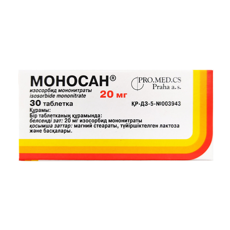 Таблетки белого цвета, с плоской поверхностью, риской, диаметром 7 мм (для дозировки 20 мг) или 9 мм (для дозировки 40 мг). | Состав+изосорбида мононитрат 20, 40 мг (эквивалентно изосорбиду-5-мононитрату, разбавленного лактозой 25, 50 мг), | Противопоказания+- известная гиперчувствительность к органическим нитратам или вспомогательным веществам препарата- одновременный прием ингибитора фосфодиэстеразы силденафила (виагра), поскольку силденафил потенцирует антигипертензивное действие нитратов- выраженная артериальная гипотензия (систолическое давление менее 90 мм рт.ст.)- острая стадия инфаркта миокарда- острая левожелудочковая недостаточность- острое нарушение кровообращения (шок, в том числе, кардиогенный, сосудистый коллапс)- гиповолемия- гипертрофическая обструктивная кардиомиопатия- тампонада полости перикарда, констриктивный перикардит- внутричерепные кровоизлияния, геморрагический инсульт, черепно-мозговые травмы- тяжелый аортальный и субаортальный стеноз, тяжелый митральный стеноз- закрытоугольная глаукома- выраженная анемия- беременность (I триместр) и период лактации- детский и подростковый возраст до 18 лет | Побочные действия+- «нитратная» головная боль, головокружение, шум в ушах, повышенное внутричерепное давление, заторможенность, общая слабость, утомляемость- повышение внутриглазного давления- гипотензия, в т.ч. ортостатическая, сопровождаемая тахикардией; при выраженной артериальной гипотензии возможно усиление симптомов стенокардии (парадоксальный эффект нитратов), возможно — выраженная парадоксальная брадикардия, коллапс, синкопальные состояния- метгемоглобинемия (при длительном лечении)- сухость во рту, тошнота, редко — рвота, ощущение легкого жжения языка- транзиторное покраснение кожи; жжение и зуд кожи, эксфолиативный дерматит- потливость, бледность | Способ применения+Внутрь за 1 ч до или через 2 ч после еды. Таблетки принимают целиком, не разжевывая, запивая небольшим количеством жидкости.Для всех показаний режим дозирования устанавливают с учетом индивидуальной чувствительности и в зависимости от тяжести заболевания. Лечение начинают с низкой дозы, медленно увеличивая ее до необходимого уровня. Начальная доза — 10-20 мг 1- 2 раза в день. Минимальная разовая доза 10 мг. Затем дозу постепенно повышают до 20-40 мг 1-2 раза/сутки.Интервал между приемами разовых доз должен составлять не менее 8 ч. В зависимости от выраженности клинического эффекта с 3-5 дня терапии разовую дозу препарата можно увеличить до 60-80 мг/сутки при той же кратности приема. Максимальная суточная доза — 80 мг. При вариантной стенокардии с частыми ночными приступами препарат следует принимать утром и непосредственно перед сном. Прекращение лечения должно быть не резким, а постепенным, поскольку не исключен «феномен отмены». | Показания к применению+- стенокардия (профилактика и лечение)- хроническая сердечная недостаточность (лечение в составе комбинированной терапии)- «легочное сердце» (лечение в составе комбинированной терапии) | МНН: Изосорбида мононитратОбъем: 20 мгАртикул: A02-0001604