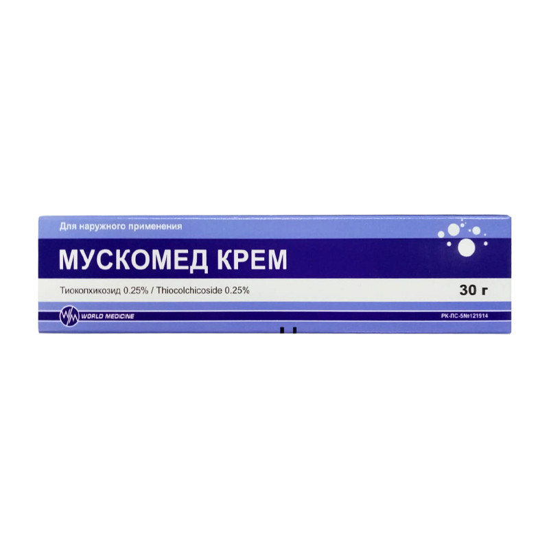 Однородный крем светло-желтого цвета | Состав+1 г крема содержиттиоколхикозида 2,5 мг | Противопоказания+- повышенная чувствительность к компонентам препарата- нарушение целостности кожных покровов- гипотония мышц- легкий паралич- терапия антикоагулянтами и предрасположенность к кровоизлияниям- беременность и период лактации- детский возраст до 15 лет | Побочные действия+- контактный дерматит, сыпь, крапивница, бронхиальная астма, ангионевротический отек- головокружение, сонливость- тошнота, рвота, боль в животе, понос | Способ применения+Мускомед крем применяют наружно.У взрослых и детей старше 15 лет Мускомед крем применяют 2-3 раза в сутки под контролем лечащего врача. Полоску крема наносят на кожу и слегка втирают. Количество применяемого препарата зависит от размера болезненной зоны.После нанесения препарата руки необходимо вымыть.Длительность лечения зависит от показаний и эффективности терапии. | Показания к применению+- симптоматическое лечение болезненных мышечных спазмов | МНН: ТиоколхикозидОбъем: