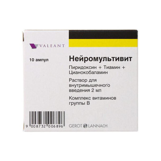 Прозрачный раствор красного цвета. | Состав+2 мл раствора содержаттиамина гидрохлорид 100 мг, пиридоксина гидрохлорид 100 мг, цианокобаламин 1 мг | Противопоказания+- повышенная чувствительность к активным или вспомогательным веществам препарата- эритремия, эритроцитоз- беременность и период лактации- гипервитаминоз витаминов группы В- детский возраст до 18 лет | Побочные действия+Очень редко ‹1-10.000- реакции повышенной чувствительности (в основном в виде кожных проявлений)- анафилактические реакции- неврологические расстройства, такие как сенсорная невропатия с потерей рефлексов, атаксия, нарушение поверхностных и глубоких сенсорных функций, симпатоплегия- гиперсекреция соляной кислоты | Способ применения+Препарат вводится только внутримышечно (в верхний наружный квадрант ягодичной мышцы).При тяжелых, острых состояниях: 1 инъекция в день до купирования синдрома.При нетяжелых состояниях: 1 инъекция 2-3 раза в неделю. | Показания к применению+- полинейропатии различного происхождения- невриты и невралгии- радикулоневриты вследствие дегенеративных заболеваний позвоночника (шейный синдром, сидром кисти и предплечья, поясничный синдром)- ишиалгия- невралгия тройничного нерва, межреберная невралгия | Объем: