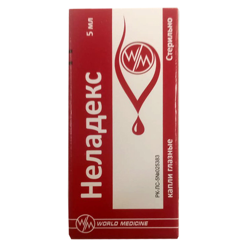 Суспензия белого цвета без запаха. | Состав+1 мл препарата содержитдексаметазон 1,0 мг,неомицин сульфат 3500 МЕ,полимиксина В сульфат 6000 МЕ | Противопоказания+- Гиперчувствительность к действующим веществам или к любому из вспомогательных веществ- простой эпителиальный герпетический кератит- коровья оспа, ветряная оспа и другая вирусная инфекция роговицы или конъюнктивы (кроме кератита, вызванного вирусом герпес зостер)- грибковые заболевания структур глаза- микобактериальные инфекции глаз- применение препарата противопоказано после неосложненного удаления инородного тела из роговицы и при любой другой инфекции или повреждении, затрагивающей поверхностный эпителий роговицы.Необходимые меры предосторожности при применении- для применения в офтальмологии- не вводить в организм в виде инъекций- не глотать | Побочные действия+Количественные критерии частоты нежелательных реакций и классификация нежелательных реакций в соответствии с системно-органной классификацией и с частотой их возникновения. Определение частоты побочных явлений проводится в соответствии со следующими критериями: очень часто (больше или равно 1/10), часто (больше или равно от 1/100 до ‹1/10), нечасто (больше или равно от 1/1000 до ‹1/100), редко (больше или равно1/10000 до ‹1/1000), очень редко (‹ 1/10000), неизвестно (невозможно оценить на основании имеющихся данных)Нечасто:- гиперчувствительность- кератит, повышенное внутриглазное давление, зуд в глазах, дискомфорт в глазах, раздражение глазНеизвестно:- язвенный кератит, нечеткое зрение, светобоязнь, мидриаз, птоз века, боль в глазах, отек глаз, ощущение инородного тела в глазах, гиперемия глаз, повышенное слезоотделение- Синдром Кушинга, подавление функций надпочечников- головная боль- синдром Стивенса-ДжонсонаПри возникновении нежелательных лекарственных реакций обращаться к медицинскому работнику, фармацевтическому работнику или напрямую в информационную базу данных по нежелательным реакциям (действиям) на лекарственные препараты, включая сообщения о неэффективности лекарственных препаратовРГП на ПХВ «Национальный Центр экспертизы лекарственных средств и медицинских изделий» Комитета медицинского и фармацевтического контроля Министерства здравоохранения Республики Казахстанhttp://www.ndda.kz | Способ применения+Хорошо встряхнуть перед использованием.Закапывать по 1-2 капли в конъюнктивальный мешок.В случае развития тяжелого инфекционного процесса препарат закапывают каждый час, по мере уменьшения явлений воспаления уменьшается частота инстилляции препарата. При легком расстройстве препарат закапывают 4-6 раз в день.Особые группы пациентовДетиНе была установлена безопасность и эффективность препарата Неладекс у детей.Пациенты пожилого возрастаДозировка такая же, как у взрослых.Пациенты с печеночной и почечной недостаточностьюПрименение препарата Неладекс у данных групп пациентов не изучалось. Однако в связи с низкой системной абсорбцией действующих веществ не требуется корректировки дозы после местного нанесения препарата.Метод и путь введенияДля применения в офтальмологии.После вскрытия флакона перед использованием препарата снимите кольцо отрыва, обеспечивающее контроль первого вскрытия.Для предотвращения загрязнения капельницы и суспензии следует соблюдать осторожность и не прикасатьс