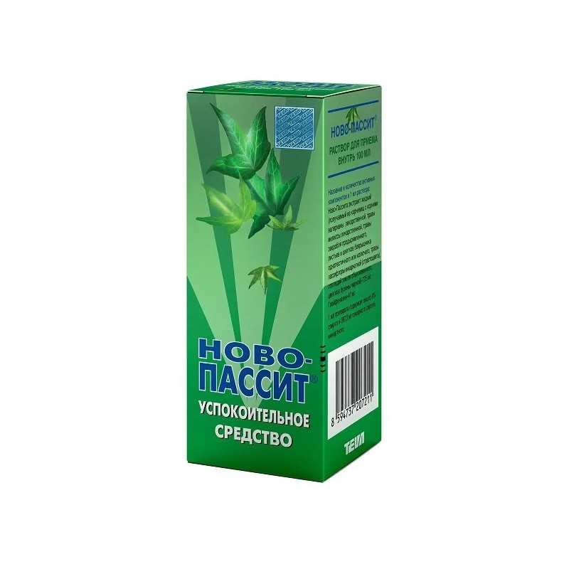 Сиропообразная, прозрачная или слегка мутная жидкость, от красно-коричневого до коричневого цвета, с характерным запахом и вкусом. Появляющийся при хранении легкий осадок, растворяющийся при встряхивании, не снижает эффект препарата. | Состав+комплекс жидких экстрактов лекарственных растений(валериана лекарственная, мелисса лекарственная, зверобой продырявленный, боярышник обыкновенный, пассифлора инкарната (страстоцвет), хмель обыкновенный, бузина черная) — 7,75г; гвайфенезин — 4,0 г в 100 мл раствора | Противопоказания+- Повышенная индивидуальная чувствительность к компонентам препарата особенно к гвайфенезину- Миастения, эпилепсия- Детский возраст до 12 лет | Побочные действия+Пациенты обычно хорошо переносят препарат. Однако в редких случаях могут появиться следующие нежелательные реакции: головокружение, усталость, сонливость, аллергические реакции, экзантема, расстройства желудочно-кишечного тракта (тошнота, рвота, спазмы, изжога, диарея, запор), снижение концентрации внимания, которые быстро проходят после отмены препарата. | Способ применения+Взрослые и дети старше 12 лет:Обычно Ново-Пассит принимается по 5 мл (1 чайная ложка) раствора 3 раза в сутки. При необходимости суточную дозу можно увеличить до 10 мл 3 раза в сутки. В случае появления нежелательной заторможенности утреннюю и дневную дозы необходимо снизить на половину и принимать по 2,5 мл, а вечером 5 мл. Дозировку можно изменять в зависимости от реакции пациента. Интервал между приемами препарата должен быть 8 часов.Раствор Ново-Пассита можно принимать вместе с напитками (чай, сок).В случае желудочно-кишечного дискомфорта или появления чувства тошноты, препарат следует принимать во время еды. | Показания к применению+- Неврастения и невротические реакции, сопровождающиеся раздражительностью, тревогой, страхом, усталостью, рассеянностью- «Синдром менеджера» (состояние постоянного психического напряжения)- Бессонница (легкие формы)- Головные боли, обусловленные нервным напряжением- Мигрень- Функциональные заболевания ЖКТ (диспептический синдром, синдром «раздраженного кишечника»)- В качестве симптоматического средства при нейроциркуляторной дистонии и климактерическом синдроме- Зудящие дерматозы (экзема атопическая и себорейная, крапивница) | Артикул: A02-0001485