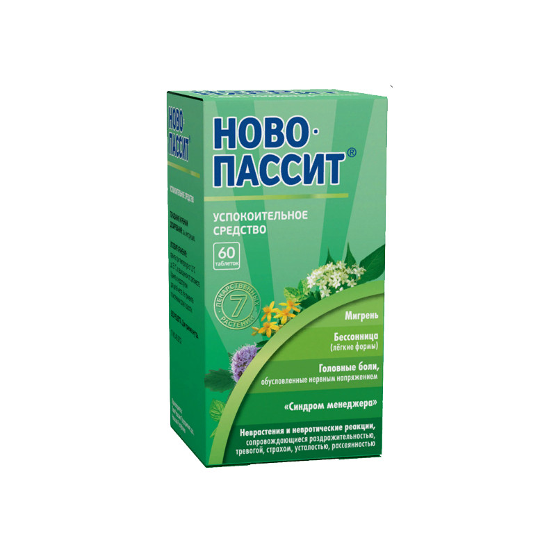 Таблетки овальной формы, покрытые оболочкой бледно-зеленого цвета с риской. | Состав+Одна таблетка содержитНОВО-ПАССИТ экстракт сухой — 157.5 мг (валериана лекарственная, мелисса лекарственная, зверобой продырявленный, боярышник обыкновенный, пассифлора инкарната (страстоцвет), хмель обыкновенный, бузина черная));Гвайфенезин — 200 мг | Противопоказания+- Повышенная индивидуальная чувствительность к компонентам препарата, особенно к гвайфенезину- миастения- эпилепсия- детский возраст до 18 лет | Побочные действия+- головокружение- усталость, сонливость- аллергические реакции, экзантема- тошнота, рвота, спазмы, изжога, диарея, запор- снижение концентрации вниманияВсе проявления побочного действия быстро проходят после отмены препарата. | Способ применения+НОВО-ПАССИТ принимается по 1 таблетке 3 раза в сутки. При необходимости суточную дозу можно увеличить до 2 таблеток 3 раза в сутки. В случае появления нежелательной заторможенности утреннюю и дневную дозы необходимо снизить на половину — ? таблетки на прием, а вечерняя доза — 1 таблетка. Дозировку можно изменять в зависимости от реакции пациента. Интервал между приемами препарата должен быть 8 часов.Таблетки НОВО-ПАССИТА следует принимать вместе с напитками (чай, сок).В случае желудочно-кишечного дискомфорта или появления чувства тошноты, препарат следует принимать во время еды. | Показания к применению+- неврастения и невротические реакции, сопровождающиеся раздражительностью, тревогой, страхом, усталостью, рассеянностью- «синдром менеджера» (состояние постоянного психического напряжения)- бессонница (легкие формы)- головные боли, обусловленные нервным напряжением- мигрень- функциональные заболевания ЖКТ (диспептический синдром, синдром «раздраженного кишечника»)- в качестве симптоматического средства при нейроциркуляторной дистонии и климактерическом синдроме- зудящие дерматозы (экзема атопическая и себорейная, крапивница). | Артикул: A01-0002452