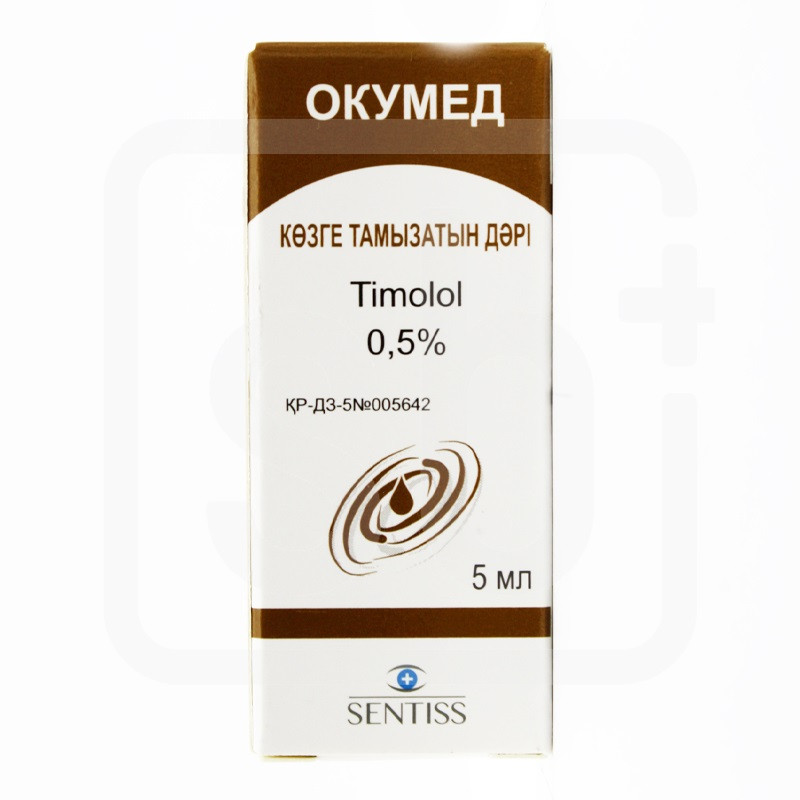 Бесцветный, прозрачный раствор | Состав+1 мл препарата содержиттимолола малеат, эквивалентно тимололу 2,5 мг или 5,0 мг | Противопоказания+Повышенная индивидуальная чувствительность к тимололу, а также пациентам, в анамнезе которых присутствуют следующие заболевания:- бронхиальная астма или другие тяжелые хронические обструктивные заболевания дыхательных путей- синусовая брадикардия- атриовентрикулярная блокада II или III степени- выраженная сердечная недостаточность- кардиогенный шок- аллергические реакции с генерализованными кожными высыпаниями- тяжелый атрофический ринит- дистрофия роговицы- период новорожденности. | Побочные действия+- раздражение и гиперемия конъюнктивы- блефароконъюнктивит (блефарит)- жжение и зуд в глазах- слезотечение или уменьшение слезоотделения- светобоязнь- отек эпителия роговицы, кератит- точечная поверхностная кератопатия- гипэстезия роговицы- диплопия- птоз- кратковременное нарушение остроты зренияПри проведении антиглаукоматозных операций возможно развитие отслойки сосудистой оболочки глаза в послеоперационном периоде.Побочные эффекты системного характера:- сердечная недостаточность, брадикардия, брадиаритмия, снижение артериального давления, коллапс, атриовентрикулярная блокада, остановка сердца, преходящие нарушения мозгового кровообращения- одышка, бронхоспазм, легочная недостаточность- головная боль, головокружение, слабость, депрессия, парестезии- тошнота, рвота, диарея- крапивница, экзема, обострение псориаза- ринит- нарушение половых функций (снижение потенции)- алопецияВ случае возникновения побочных эффектов, следует прекратить применение препарата и как можно скорее обратиться к лечащему врачу. | Способ применения+Местно. В начале терапии закапывают по 1 капле препарата «Окумед» 0,25 % или 0,5 % в больной глаз 2 раза в день.Если внутриглазное давление при регулярном применении нормализуется, следует снизить дозировку — по одной капле 1 раз в день.Лечение препаратом «Окумед» проводится, как правило, в течение продолжительного времени. Перерыв или изменение дозировки проводятся только по предписанию лечащего врача. | Показания к применению+- повышенное внутриглазное давление (офтальмогипертензия)- октрытоугольная глаукома- афакическая глаукома и другие виды вторичной глаукомы- в качестве дополнительного средства для снижения внутриглазного давления при закрытоугольной глаукоме (в комбинации с миотиками)- врожденная глаукома (при недостаточности прочих терапевтических мер). | МНН: ТимололОбъем: 0.5 %Артикул: A01-0002472