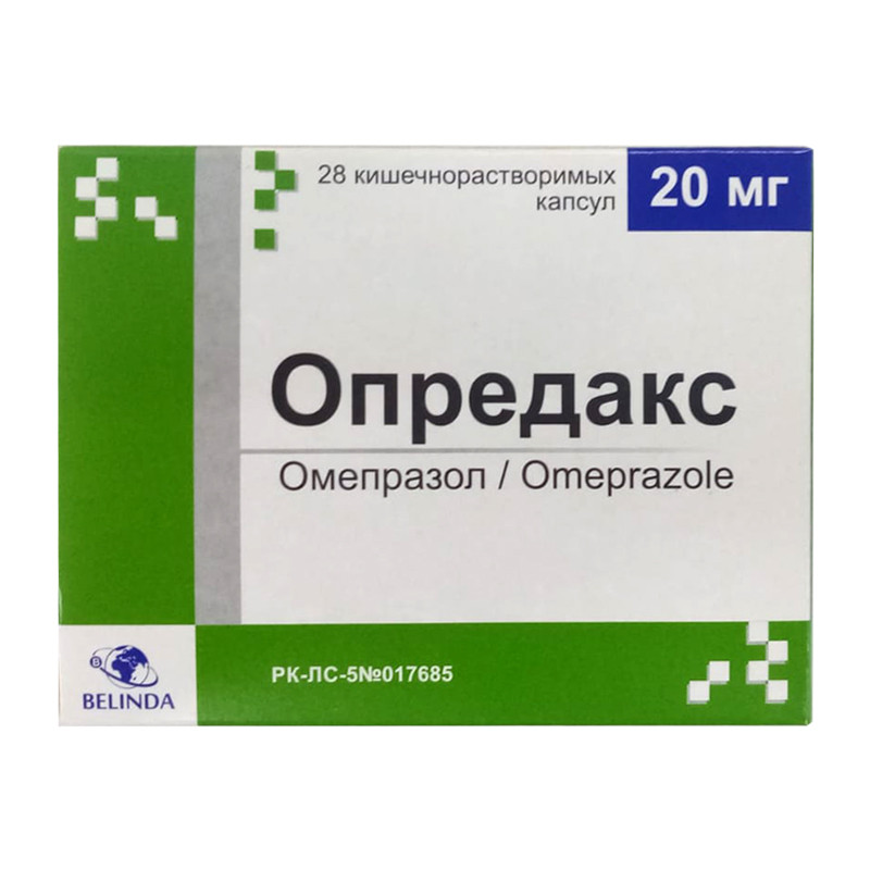 Твердые желатиновые капсулы размером №2, с корпусом и крышечкой матово-желтого цвета (для дозировки 20 мг).Твердые желатиновые капсулы размером №0, с корпусом белого цвета и крышечкой матово-синего цвета (для дозировки 40 мг).Содержимое капсул -микрогранулы почти белого или светло-кремового цвета, сферической формы (для дозировок 20 и 40 мг). | Состав+Одна капсула содержитомепразол 20, 0000 мг, 40, 0000 мг | Противопоказания+- Повышенная чувствительность к активному веществу или любому из компонентов препарата- одновременный прием с атазанавиром, нелфинавиром- редкие наследственные заболевания, связанные с непереносимостью фрукто-зы, с мальабсорбцией галактозы-глюкозы или недостаточностью сахарозы- изомальтозы- беременность и период лактации- детский и подростковый возраст до 18 лет | Побочные действия+Побочные реакции были выявлены при клинических испытанияхс омепразолом и пост-маркетинговом наблюдении, ни одна из них не была признанадозо-зависимой. Наиболее распространенные побочные реакции (у 1-10% пациентов): головная боль, боли в животе, запор, диарея, метеоризм и тошнота/рвота.Побочные реакции, перечисленные ниже, классифицируются в соответствии со следующейклассификацией: очень часто (› 1/10), часто (› 1/100, ‹1/10), нечасто (› 1/1000, ‹1/100), редко (› 1/10000, ‹1/1000), очень редко (‹1/10000), не известно (частота не может быть оцененаиз имеющимся данным).Часто:- головная боль- диарея, запор, метеоризм (с болью в животе), тошнота, рвота.Нечасто:- бессоница, головокружение, параэстезия, сонливость, вертиго- повышениеуровняпеченочныхферментов- дерматит, зуд, сыпь, крапивница- перелом бедра, запястья и позвоночника- недомогание, периферическиеотекиРедко:- лейкопения, тромбоцитопения- гиперчувствительность, например, лихорадка, отек Квинке и анафилактическая реакция / шок- гипонатремия- возбуждение, спутанность сознания, депрессия, искажение вкусовых ощущений- нечёткостьзрения- бронхоспазм- сухость во рту, стоматит, желудочно-кишечного кандидоз- гепатит с желтухой или без желтухи- облысение, светочувствительность- артралгия, миалгия- интерстициальныйнефрит- повышенноепотоотделениеОчень редко:- панцитопения, агранулоцитоз- печеночная недостаточность, энцефалопатия у пациентов с уже существующимзаболеванием печени- агрессия, галлюцинации- мультиформная эритема, синдром Стивенса-Джонсона, токсический эпидермальныйнекролиз- мышечнаяслабость- гинекомастияНе известно:-гипомагниемия; тяжелая гипомагниемия может привести к гипокальциемии- микроскопическийколит- подострая кожная красная волчанка | Способ применения+ВзрослыеКапсулу необходимо проглатывать целиком, запивая водой, перед едой (например, перед завтраком или обедом) на голодный желудок. Не следует разжевывать или толочькапсулы. Капсулы можно открыть, содержимое капсулы смешать с небольшим количеством йогурта или сока, сразу проглотить.При язве двенадцатиперстной кишки обычная рекомендуемая доза составляет 20 мг один раз в сутки. У большинства пациентов заживление происходит в течение двух недель. Для тех пациентов, которые не могут быть полностью излечены после начального курса, заживление обычно происходит во время следующих двух недель лечения. У пациентов с плохо поддающейся лечению язвой двенадцатиперстной кишки рекомендуется препарат Опредакс в дозировке 40 мг один раз в день (в