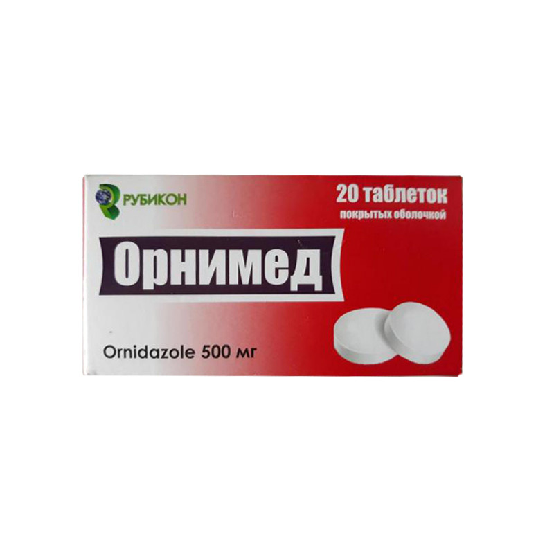 Таблетки цилиндрические, двояковыпуклые, белого цвета. | Состав+Одна таблетка содержиторнидазол 500 мг | Противопоказания+Гиперчувствительность к препарату или другим производным нитроимидазола. Поражение центральной нервной системы (эпилепсия, поражение головного мозга, рассеянный склероз). Патологические поражения крови или другие гематологические аномалии.С осторожностью:- беременность, период лактации;- заболевания печени и алкоголизм. | Побочные действия+Побочные эффекты орнидазола дозозависимы.Со стороны крови: влияние на костный мозг и нейтропения.Со стороны иммунной системы: кожные реакции и реакции гиперчувствительности.Со стороны нервной системы: тремор, ригидность, нарушение координации, судороги, временная потеря сознания, признаки сенсорной или смешанной периферической нейропатии, головокружение, сонливость.Со стороны пищеварительного тракта: тошнота, рвота, металлический привкус во рту.Если любые из указанных в инструкции побочных эффектов усугубляются или отмечаются любые другие побочные эффекты, не указанные в инструкции, следует немедленно обратиться к врачу. | Способ применения+Принимают внутрь после еды, запивая небольшим количеством воды.Трихомониаз:Рекомендуемые схемы дозировки препарата:а) курс лечения — 1 день:- Взрослые и дети с массой тела более 35 кг — 3 таблетки на прием вечером;- Суточная доза для детей с массой тела более 20 кг составляет 25 мг/кг массы тела и назначается в 1 прием;б) курс лечения — 5 дней:- Взрослые и дети с массой тела более 35 кг — по 2 таблетки (по 1 таблетке утром и вечером).Детям с массой тела менее 35 кг — не рекомендуется.Чтобы устранить возможность повторного заражения, половой партнер должен пройти такой же курс лечения.Амёбиаз.Возможные схемы лечения:а) 3-дневный курс лечения больных с амёбной дизентерией;б) 5-10-дневный курс лечения при всех формах амёбиаза.Рекомендуемая схема дозирования препарата:Продолжительность Суточная дозалечения Взрослые и дети Дети с массой тела до 35 кгс массой телаболее 35 кга) амёбная дизентерия 3 таблетки на прием 35 кг — 3 таблетки на 1 прием- 3 дня вечером. 25 кг — 2 таблетки на 1 приемПри массе тела 13 кг — 1 таблетка на 1 приемболее 60 кг (Рассчитывается как 40 мг4 таблетки (по орнидазола на 1 кг массы тела на2 таблетки утром и 1 прием)вечером)б) другие формы По 2 таблетки (по 35 кг — 2 таблетки на 1 приемамёбиаза — 5-10 дней 1 таблетке утром и 20 кг — 1 таблетка на 1 приемвечером) (Рассчитывается как 25 мгорнидазола на 1 кг массы телана 1 прием)Лямблиоз:Взрослым и детям с массой тела более 35 кг назначают 3 таблетки однократно вечером, детям с массой тела менее 35 кг — одноразовый прием дозы из расчета 40 мг/кг массы тела в сутки. Продолжительность лечения составляет 1-2 дня.Профилактика инфекций, вызванных анаэробными бактериями:Продолжительность послеоперационной терапии, как правило, составляет 5 — 10 дней, однако ее следует определять, исходя из клинических данных оперированного. Орнидазол следует назначать после стабилизации состояния оперированного и возможности самостоятельного применения. Назначают по 1 таблетке каждые 12 часов.Для детей суточная доза составляет 20 мг на 1 кг массы тела в 2 приема в течение 5-10 дней.Для профилактики смешанных инфекций следует применять орнидазол в комбинации с аминогликозидами, антибиотиками пенициллинового и цефалоспоринов