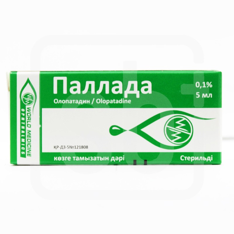 Прозрачный бесцветный раствор | Состав+1 мл препарата содержитолопатадина 1 мг (в форме олопатадина гидрохлорида 1,11 мг) | Противопоказания+- повышенная чувствительность к олопатадину или другим компонентам препарата- детский возраст до 8 лет. | Побочные действия+Местные (менее 5% )Часто- жжение и боль в глазах, слезотечение, ощущение инородного тела в глазу, кератит, ирит, припухлость век.Нечасто:- светобоязнь, дискомфорт в глазу, ощущение инородного тела в глазу- затуманивание зрения- снижение остроты зрения- зуд глаза, гиперемия глаз- выделение из глаз, слезоточивость- блефароспазм- нарушение со стороны век, отек, покраснение века, конъюнктивиты, конъ-юнктивальные фолликулы, гиперемия конъюнктивы- нарушение роговичного эпителия, эрозия роговицы, окрашивание роговицы- кератиты, точечный кератитСистемные ( 0,1-1%)- слабость, головная боль, головокружение, тошнота, фарингит, ринит, сину-сит, изменение вкуса | Способ применения+Только для местного применения.Перед применением флакон следует встряхнуть.Взрослым и детям старше 8 лет препарат Паллада закапывают в нижний конъюнктивальный мешок пораженного глаза по 1 капле 2 раза в день. Ин-тервал между инстилляциями составляет 6-8 часов.Не следует прикасаться кончиком пипетки к какой-либо поверхности, чтобы избежать загрязнения раствора.Длительность лечения определяет лечащий врач. | Показания к применению+- аллергические конъюнктивиты | МНН: ОлопатадинОбъем: Капли глазныеАртикул: A01-0005472
