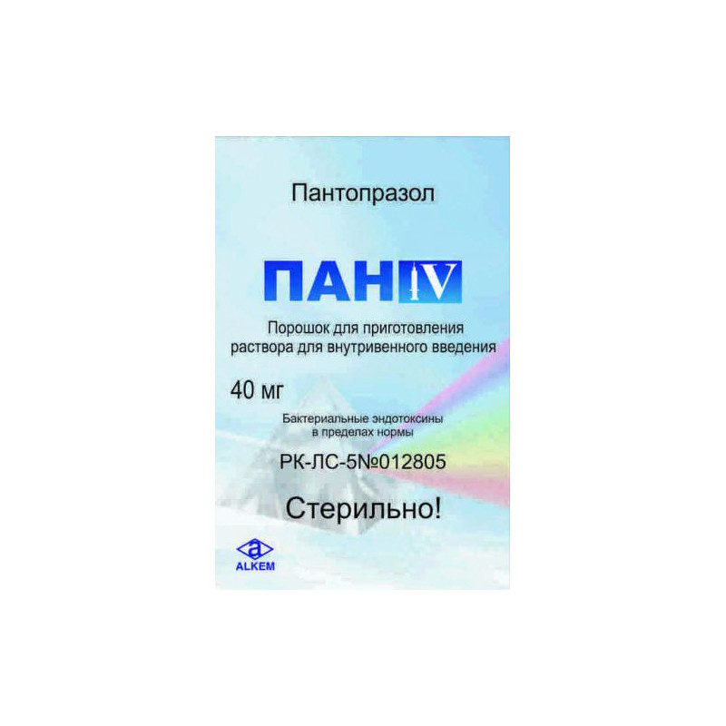Белый или почти белый лиофилизованный порошок | Состав+пантопразол 40 мг(в виде натрия пантопразола) | Противопоказания+-выраженные нарушения функции почек- повышенная чувствительность к пантопразолу- детский возраст до 14 лет. | Побочные действия+- диарея; редко — тошнота, боли в верхней части живота, метеоризм- головная боль; редко — слабость, головокружение; в единичных случаях — начальные проявления депрессивных состояний, нарушения зрения- редко — сыпь, зуд- слабость, головокружение; в единичных случаях — отеки, повышение температуры тела. | Способ применения+Средняя терапевтическая доза составляет 40 мг/сут. Максимальная доза — 80 мг/сут. Продолжительность курса терапии устанавливают в зависимости от показаний, но она не должна превышать 8 недель.При уменьшении степени тяжести симптомов (обычно через4 недели после начала лечения) для продолжения терапии рекомендуется переход на пероральные формы препарата (ПАН-20, ПАН-40).Правила приготовления и введения препаратаРаствор для внутривенного введения: во флакон с сухим, стерильным порошком добавляют необходимый объем 0,9% раствора натрия хлорида инъекций (10 мл во флакон, содержащий 40 мг пантопразола).Полученный раствор нужно вводить внутривенно медленно в течение 2-15 минут или инфузионно.Раствор для инфузии: во флакон с сухим, стерильным порошком добавляют необходимый объем 0,9% раствора натрия хлорида инъекций (10 мл во флакон, содержащий 40 мг пантопразола). Приготовленный раствор подлежит дальнейшему разведению 5% раствором декстрозы для инъекций, раствором Рингера или 0,9% раствором натрия хлорида для инъекций до объема 100 мл. Приготовленные растворы могут храниться в холодильнике (2-8°С) в течение 22 ч без значительной потери активности препарата.ПАН IV не рекомендуется разводить другими растворителями, т.к. раствор препарата теряет стабильность и возможность хранения в холодильнике. | Показания к применению+- язвенная болезнь желудка или двенадцатиперстной кишки, в т.ч. ассоциированная с Helicobacter pylori (в комбинации с антибактериальной терапией)- синдром Золлингера-Эллисона- гастроэзофагеальный рефлюкс (болезнь). | МНН: ПантопразолОбъем: