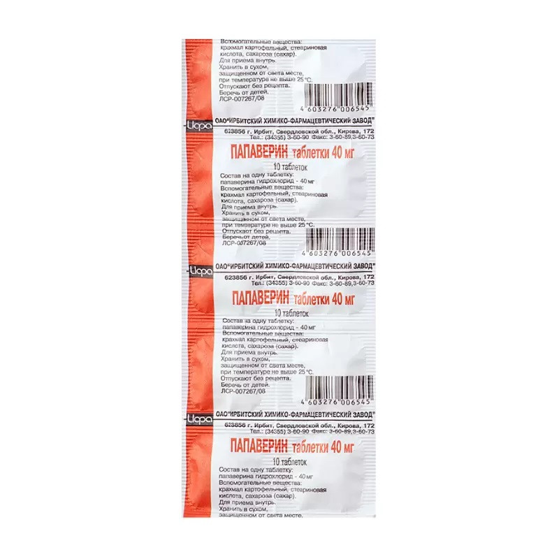 Таблетки белого цвета, плоскоцилиндрические с риской и фаской. | Состав+Одна таблетка содержитпапаверина гидрохлорид 0.040 г | Противопоказания+повышенная чувствительность к папаверину и другим компонентампрепаратаугнетение дыхания или коматозное состояниеатриовентикулярная блокадаглаукомадетский возраст до 10 летвозраст старше 75 лет (риск гипертермии) | Побочные действия+тошнота, запорысонливостьповышенная потливостьповышение уровня трансаминаз, эозинофилиягипотензия, атриовентикулярная блокада, желудочковая экстрасистолия | Способ применения+Применяют внутрь натощак. Взрослым назначают по 0.04-0.06 г (1-1 1/2 таблетки) 3-5 раз в сутки. Высшая разовая доза 0.4 г (10 таблеток), максимальная суточная доза — 0.60 г (15 таблеток). Продолжительность курса лечения составляет 10-14 дней, при необходимости возможно проведение повторных курсов применения препарата с интервалом в 7-10 дней.У лиц старше 70 лет начальная разовая доза не более 0.01 г (1/4 таблетки).Детям с 10 лет назначают в дозе 0.3-0.5 мг/кг веса 2-3 раза в день. | Показания к применению+спазмы гладких мышц внутренних органов при холецистите, спастическом колите, пилороспазме (профилактика и купирование)энцефалопатии сосудистого генеза (в составе комплексной терапии) | МНН: ПапаверинОбъем: