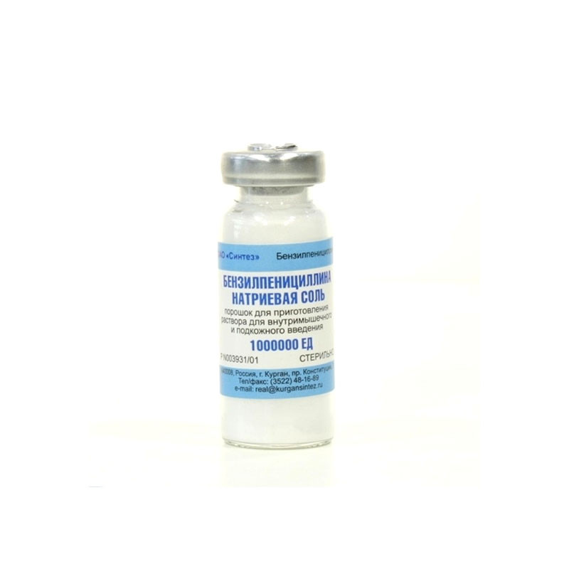 Белый или почти белый мелкокристаллический порошок со слабым характерным запахом | Состав+бензилпенициллина натриевая соль 1000000 ЕД | Противопоказания+- повышенная чувствительность к пенициллину и к другим бета-лактамным антибиотикам- эндолюмбальное введение при эпилепсии. | Побочные действия+-гипертермия, крапивница, кожная сыпь, сыпь на слизистых оболочках, артралгия, эозинофилия, ангионевротический отек, интерстициальный нефрит, бронхоспазм, редко анафилактический шок- отеки, увеличение объема циркулирующей крови, возможно снижение насосной функции миокарда- нарушение функции печени и почек- тошнота, рвота- повышение рефлекторной возбудимости, менингеальные симптомы, судороги, кома | Способ применения+Бензилпенициллина натриевую соль вводят внутримышечно.При внутримышечном введении разовые дозы при среднетяжелом течении инфекции верхних и нижних отделов дыхательных путей, мочевыводящих и желчевыводящих путей, инфекций мягких тканей и др. составляют 250000-500000 ЕД 4 — 6 раз в сутки. При тяжелом течении инфекций (сепсис, септический эндокардит, менингит и др.) -10-20 млн ЕД в сутки; при газовой гангрене — до 40-60 млн ЕД.Суточная доза для детей в возрасте до 1 года -50000-100000 ЕД/кг,старше 1 года-50000 ЕД/кг; при необходимости -200000-300000 ЕД/кг, по жизненным показаниям — увеличение до 500000 ЕД/кг. Кратность введения — 4 — 6 раз в сутки.Раствор препарата для внутримышечного введения готовят непосредственно перед введением, добавляя к содержимому флакона 1-3 мл воды для инъекций, 0,9 % раствора натрия хлорида изотонического или 0,5 % раствора новокаина. При растворении бензилпенициллина в растворе новокаина может выпасть осадок новокаиновой соли бензилпенициллина, что не является препятствием для внутримышечного введения препарата. Внутримышечно препарат вводят глубоко в мышцу.Длительность лечения бензилпенициллином в зависимости от формы и тяжести течения заболевания — от 7 до 10 дней. | Показания к применению+- пневмония, эмпиема плевры, бронхит- сепсис, септический эндокардит (острый и подострый)- перитонит- менингит- остеомиелит- пиелонефрит, пиелит, цистит, уретрит, цервицит- гонорея, бленорея, сифилис- холангит, холецистит- раневая инфекция, рожа, импетиго, вторично инфицированные дерматозы- дифтерия, скарлатина, сибирская язва, актиномикоз- гайморит, отит- гнойный коньюктивит. | МНН: БензилпенициллинОбъем: 1000000 ЕДАртикул: A02-0000909