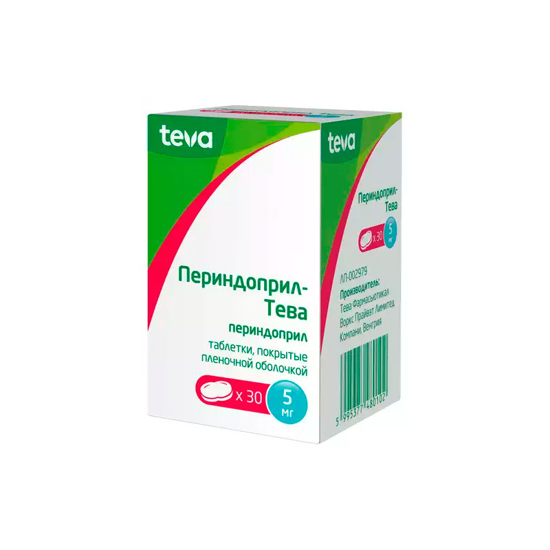 Двояковыпуклые таблетки капсулообразной формы, покрытые пленочной оболочкой светло-зеленого цвета, с декоративной риской по краю таблетки с обеих сторон. На одной стороне — гравировка «Т» (для дозировки 5 мг).Круглые двояковыпуклые таблетки, покрытые пленочной оболочкой зеленого цвета. На одной стороне — гравировка «10», на другой — «Т» (для дозировки 10 мг). | Состав+Одна таблетка содержитпериндоприла тозилат 5,0 мг(периндоприла) (3,395) мгОдна таблетка содержитпериндоприла тозилат 10,0 мг(периндоприла) (6,790) мг | Противопоказания+- Повышенная чувствительность к активному веществу и одному из вспомогательных веществ, или любому другому ингибитору АКФ.- в анамнезе ангионевротический отек, связанный с предыдущим лечением ингибиторами АКФ.- наследственный или идиопатический ангионевротический отек.- второй и третий триместр беременности.- комбинированный прием Периндоприл-Тева с препаратами, содержащими алискирен, пациентами, страдающими сахарным диабетом или почечной недостаточностью (СКФ ‹ 60 мл/мин/1,73 м?).- одновременное применение с сакубитрилом и валсартаном.- экстракорпоральные процедуры, при которых кровь контактирует с отрицательно заряженными поверхностями.- выраженный двусторонний стеноз почечных артерий или стеноз артерии единственной функционирующей почки- противопоказано лицам с наследственной непереносимостью фруктозы, дефицитом фермента Lapp-лактазы, мальабсорбцией глюкозы-галактозы- дети и подростки до 18 лет (эффективность и безопасность не установлена). | Побочные действия+Часто- кашель, одышка- головная боль, астения, головокружение, мышечные судороги, парестезия, дисгевзия, нарушения зрения, тиннитус, вертиго, гипотензия (и эффекты, связанные с гипотензией)- рвота, тошнота, боли в животе, запор, диарея, диспепсия- зуд, сыпь- гиперкалиемия, обратимая при прекращении лечения*, повышенное содержание мочевины в крови*, повышенное содержание креатинина в крови*Нечасто- эозинофилия*- гипонатриемия*- гипогликемия*- сонливость*- синкопа*, недомогание*, боль в груди*- тахикардия*, учащенное сердцебиение*- васкулит*, периферический отек*, гипертермия*- реакции светочувствительности*- артралгия*, миалгия*- падение*- перепады настроения- нарушения сна- бронхоспазм- сухость во рту- крапивница- пемфигоид, гипергидроз- почечная недостаточность- эректильная дисфункция- ангионевротический отек лица, конечностей, губ, слизистых оболочек, языка, голосовой щели и/или гортаниРедко- повышенное содержание билирубина в крови, повышение уровня ферментов в печениОчень редко- аритмия, стенокардия, инфаркт миокарда, возможно вызванный чрезмерным снижением АД у пациентов группы высокого риска, инсульт, возможно вызванный чрезмерным снижением АД у пациентов группы высокого риска- эозинофильная пневмония, ринит- панкреатит- гепатит, цитолитический или холестатический- эритема многоформная- пониженный гемоглобин и гематокрит, агранулоцитоз или панцитопения, лейкопения/нейтропения, гемолитическая анемия у пациентов с врожденной недостаточностью- глюкозо-6-фосфатдегидрогеназы, тромбоцитопения- спутанность сознания- острая почечная недостаточность* Частота подсчитана по результатам клинических исследований на предмет побочных явлений, выявленных из спонтанных сообщений.При возникновении нежелательных лекарственных реакций обращат