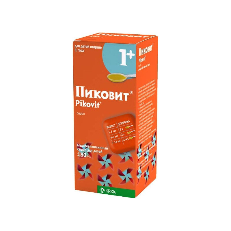 Густая вязкая жидкость оранжевого цвета | Состав+5 мл сиропа содержатретинола пальмитат (витамин А) 900 МЕхолекальциферол (витамин D3) 100 МЕрибофлавин (витамин В2) 1 мгпиридоксина гидрохлорид (витамин В6) 0,6 мгтиамина гидрохлорид (витамин В1) 1 мгцианкобаламин (витамин В12) 1 мкгаскорбиновая кислота (витамин С) 50 мгникотинамид (витамин РР) 5 мгd-пантенол 2 мг | Противопоказания+- повышенная чувствительность к компонентам препарата- сахарный диабет (Пиковит сироп для детей, содержит 3 г сахара в 5 мл сиропа). | Побочные действия+- аллергические реакции . | Способ применения+Препарат принимается внутрь.Дети в возрасте от 1 до 3 лет: рекомендуется давать 2 ложки (10 мл) сиропа в сутки.Дети в возрасте от 4 до 6 лет: по 1 ложке сиропа 3 раза в день (15 мл) сиропа в сутки.Детям в возрасте от 7 до 14 лет: по 1 ложке 3-4 раза в день (15-20 мл) сиропа в сутки.Сироп можно давать с ложечки или смешивать с чаем, соком или фруктовым пюре. При отсутствии аппетита сироп следует давать ежедневно в течение 1 месяца. Повторный курс приема через 1-3 месяца. Не превышайте рекомендованной суточной дозы. | Показания к применению+- профилактика состояний, сопровождающихся повышенной потребностью в витаминах- переутомление у детей школьного возраста- повышенная физическая и нервно-психическая нагрузка- отсутствие аппетита и нерегулярный, неполноценный или однообразный рацион питания- в период выздоровления после перенесенных заболеваний- для повышения сопротивляемости организма к инфекционным и простудным заболеваниям- в комплексной терапии при применении химиотерапевтических средств. | Объем: 150млАртикул: A02-0001915