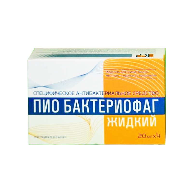Прозрачная жидкость желтого цвета различной интенсивности со специфическим вкусом | Состав+1 флакон препарата содержитсмесь стерильных фильтратов фаголизатов бактерий: Streptococcus. Staphylococcus, Escherichia Coli, Pseudomonas aeruginosa, Proteus не менее 1×106 КОЕ | Противопоказания+-гиперчувствительность к какому-либо компоненту препарата | Побочные действия+Нежелательные эффекты и реакции, связанные с применением ПИО БАКТЕРИОФАГА не отмечены. | Способ применения+Важным условием успешного применения препаратов бактериофагов является определение фагочувствительности возбудителя и раннее применение препарата. Особенно эффективен препарат в начальной стадии заболевания и при применении непосредственно в очаге поражения.ПИО БАКТЕРИОФАГ назначается для приема внутрь (через рот), в виде клизм, местно (в виде полосканий, орошений, примочек), для введения в полость: раны, абсцесса, брюшной, плевральной полости, флегмоны, носа, среднего уха, мочевого пузыря, матки, влагалища.Для лечения гнойно-воспалительных заболеваний с локальными поражениями ПИО БАКТЕРИОФАГ назначается одновременно как местно, так и для приема внутрь. Длительность курса лечения препаратом от 5 до 10 дней. Дозировка определяется индивидуально, в зависимости oт размеров пораженного участка. Препарат вводится в полость очага после удаления гноя с помощью пункции. Количество вводимого препарата должно быть несколько меньше объема удаленного гноя. В последующие дни, вводится препарат в инфицированную полость, с помощью дренажа. Процедура проводится 1 раз в день, в течение 3-5 дней.При циститах, пиелонефритах, уретритах препарат принимается внутрь. В случае если полость мочевого пузыря или почечной лоханки дренированы, бактериофаг вводят 2 раза в день по 20-30 мл в мочевой пузырь и по 5-10 мл в почечную лоханку.При гнойно-воспалительных гинекологических заболеваниях препарат вводится в полость вагины, матки, в дозе 5-10 мл ежедневно, однократно.При гнойно-воспалительных заболеваниях уха, горла, носа препарат вводится местно в дозе 2-10 мл 2 -3 раза в день. Бактериофаг используют для полоскания, промывания, закапывания, введения смоченных турунд (оставляя их на I час). Для лечения гнойного тонзиллита препарат применяется для полоскания и назначается одновременно внутрь.При лечении стоматитов и хронических генерализованных парадонтитовпрепарат применяется в виде полосканий полости рта 3-4 раза в день в дозе 10-20 мл, а также вводятся в парадонтальные карманы турунды, пропитанные ПИО БАКЛЕРИОФАГОМ, на 5-10 минут.При кишечных инфекциях, заболеваниях внутренних органов, дисбактериозе кишечника ПИО БАКТЕРИОФАГ применяется перорально внутрь или в клизме. Назначается натощак за 0,5 -1 час до еды. В виде клизм назначается 1 раза в день, вечером перед сном, после опорожнения кишечника.Рекомендуемые дозировки препарата при всех заболеваниях, при которых показан прием внутрь и в клизмеВозраст Внутрь (в день) В клизме (в день)Дети в возрасте от 0 до 6 месяцев 5мл х 1 раз за 30мин до кормления 10 мл х1 разДети в возрасте от 6 до 12 месяцев 5мл х 2 раз за 30мин до еды 10 мл х1 разДети в возрасте от 1 года до 3 лет 5мл х 3 раз за 1 час до еды 20 мл х1 разДети в возрасте от 3 лет до 8 лет 10мл х 2-3 раз за 1 час до еды 30 мл х1 разДети старше 8 лет, взрослые 20мл х 2-3 раз за 1 час до еды 40 мл х1 разСвежие раны для профилактики гнойных осложнений при хирургически