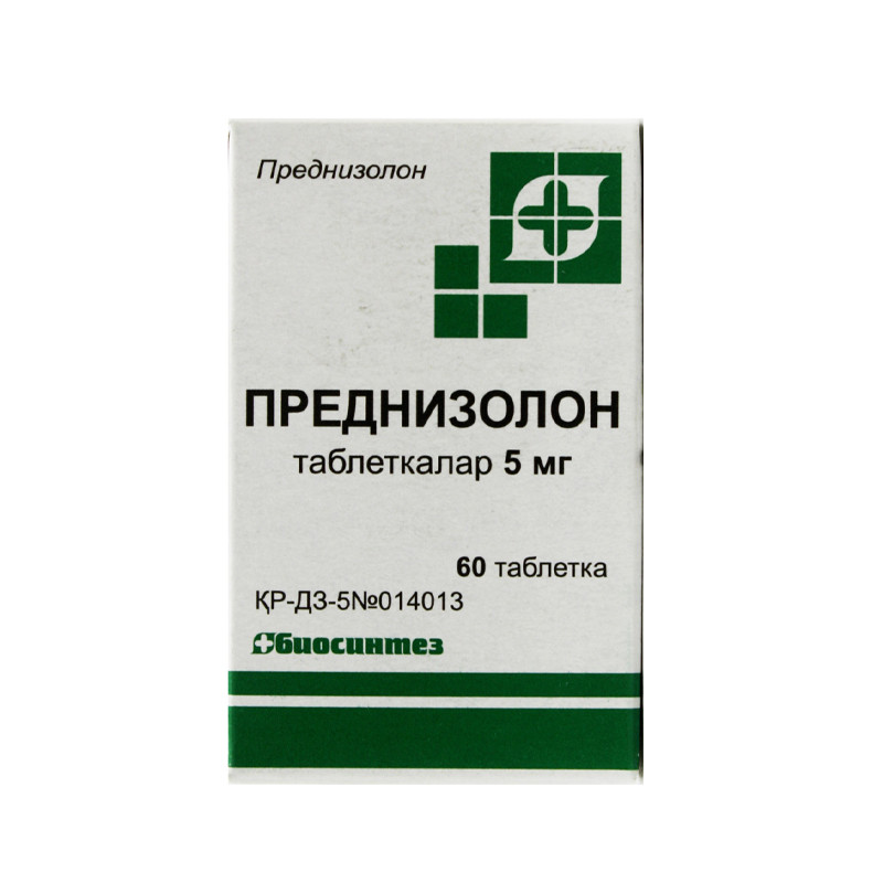 Таблетки белого цвета | Состав+Одна таблетка содержитпреднизолон 0,005 г | Противопоказания+Для кратковременного применения по витальным показаниям единственным противопоказанием является повышенная чувствительность к преднизолону или компонентам препарата.Для длительной терапии, кроме повышенной чувствительности к преднизо-лону, противопоказаниями к применению препарата являются:- язвенная болезнь желудка и 12-перстной кишки- остеопороз- синдром Кушинга- склонность к тромбоэмболии- тяжелая артериальная гипертензия- почечная недостаточность- системные микозы и паразитарные заболевания- острые вирусные инфекции- продуктивная симптоматика при психических заболеваниях- активная форма туберкулеза- полиомиелит- лимфаденит после вакцинации БЦЖ- глаукома- период вакцинации (приблизительно за 8 недель до и в течение 2 недель после профилактической иммунизации).- период лактации | Побочные действия+Риск развития побочных эффектов обычно меньше при кратковременной те-рапии.При длительной терапии могут отмечаться:- развитие синдрома Кушинга, увеличение массы тела- подавление функции надпочечников- замедление роста у детей- нарушение секреции половых гормонов (аменорея, гирсутизм, импотен-ция)- нарушение толерантности к углеводам- сахарный диабет- отрицательный азотистый баланс- задержка натрия и воды в организме с образованием отеков- повышение выведения калия (опасность развития нарушения сердечного ритма!)- красные полосы растяжения (стрии)- атрофия кожи, петехии, экхимоз, стероидные акне, периоральный дер-матит,Редко:- реакции гиперчувствительности, например, экзантема.- мышечная атрофия- остеопороз (даже кратковременная терапия малыми дозами может вести к потере костной массы)- асептические некрозы костей (головка плечевой и бедренной кости)- депрессия, раздражительность, эйфория- повышение сексуального влечения, повышение аппетита- активация скрытой эпилепсии- артериальная гипертензия- повышенный риск развития тромбоза- васкулит (может также проявляться как симптом «отмены» после дли-тельной терапии)- умеренный лейкоцитоз, эозинопения, иммуносупрессия, замедление за-живления ран- снижение сопротивляемости к инфекциям- маскирование инфекции- стероидная катаракта, стероидная глаукомаМогут подавляться кожные реакции при проведении аллергических проб. | Способ применения+Доза препарата и продолжительность лечения устанавливается врачом инди-видуально в зависимости от показаний и тяжести заболевания. Всю суточную дозу препарата рекомендуется принимать однократно или двойную суточную дозу — через день с учетом циклических колебаний интенсивности различных биологических процессов связанных со сменой дня и ночи эндогенной сек-реции глюкокортикоидов в интервале от 6 до 8 часов утра. Высокую суточ-ную дозу можно распределить на 2-4 приема, при этом по утрам следует принимать большую дозу. Таблетки следует принимать во время или непо-средственно после еды, запивая небольшим количеством жидкости.При острых состояниях и в качестве заместительной терапии взрослым на-значают в начальной дозе 0,02-0,03 г/сут, поддерживающая доза составляет -0,005-0,01 г/сут. При необходимости начальная доза может составлять 0,015-0,1 г/сут, поддерживающая — 0,005-0,015 г/сут.Для детей начальная доза составляет 0,001-0,002 г/кг массы тела в сутки в 4-6 прие