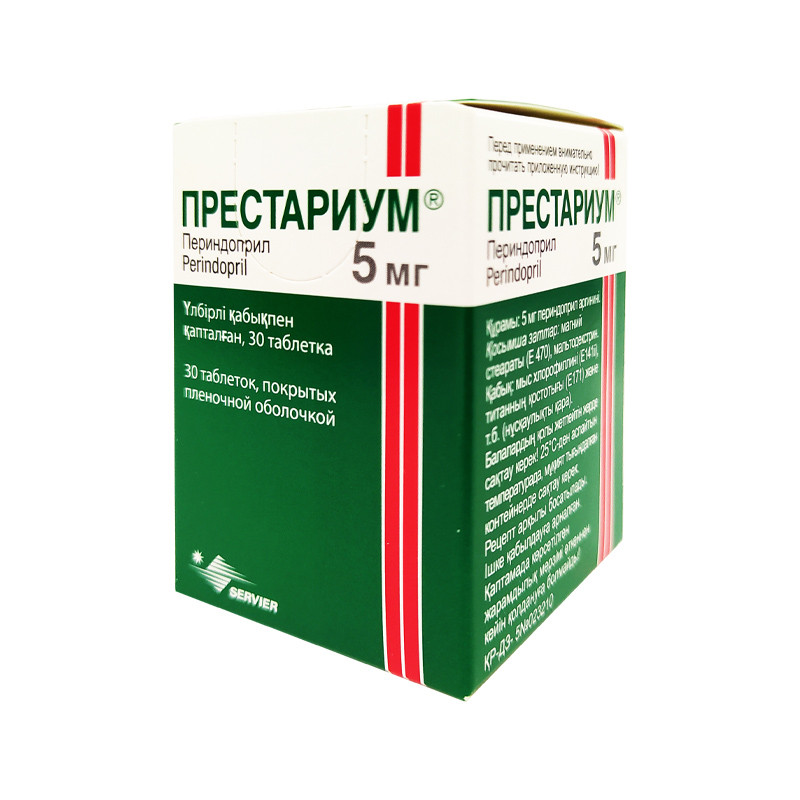 Светло-зеленые таблетки удлиненной формы, с пленочным покрытием, с линией деления на каждой стороне и выдавленным логотипом    на одной стороне | Состав+Одна таблетка содержитпериндоприла аргининовая соль 5,0 мг(эквивалентно содержанию периндоприла 3,395 мг), | Противопоказания+- гиперчувствительность к периндоприлу и другим составным компонентам препарата или любому другому ингибитору АПФ- ангионевротический отек (наследственный или идиопатический) на фоне предыдущей терапии ингибиторами АПФ в анамнезе- беременность (II — III триместр) и период лактации. | Побочные действия+- кашель (часто описываемый как сухой или раздражающий), затруднение дыхания- головная боль, астения, головокружение, судороги, парестезии, нарушения вкусовых ощущений, нарушения зрения, шум в ушах, вертиго, нарушения настроения и сна, очень редко — спутанность сознания- артериальная гипотензия- тошнота, рвота, боли в области живота, дисгевзия, диарея или запор- сыпь, кожный зуд- гиперкалиемия, преходящее повышение уровня мочевины и креатинина в сыворотке кровиРедко- бронхоспазм- сухость во рту, повышение активности печеночных ферментов и уровня билирубина в сыворотке- почечная недостаточность, импотенция- ангионевротический отек, крапивница- повышенное потоотделениеОчень редко- аритмия, стенокардия, инфаркт миокарда и инсульт- эозинофильная пневмония, ринит- панкреатит, цитолитический или холестатический гепатит- эритема (различные виды)- снижение уровня гемоглобина и гематокрита, тромбоцитопения, лейкопения/нейтропения, агранулоцитоз или панцитопения, гемолитическая анемия (у пациентов с врожденной недостаточностью фермента глюкозо-6-фосфатдегидрогеназы (G-6PDH)). | Способ применения+Препарат рекомендуется принимать утром, 1 раз в сутки, перед едой, запивая стаканом воды.При лечении артериальной гипертензии Престариум  5мг может использоваться в качестве монотерапии либо в комбинации с гипотензивными препаратами других классов. Рекомендуемая начальная доза — 5мг в сутки, при необходимости доза постепенно может быть увеличена до 2 таблеток (10мг) в сутки.При выраженной активации системы «ренин-ангиотензин-альдостерон» (в частности, у пациентов с реноваскулярной гипертензией, электролитными нарушениями и/или со сниженным объемом циркулирующей крови (ОЦК), декомпенсацией сердечной деятельности или тяжелой гипертензией) после приема начальной дозы может наступить резкое падение артериального давления. Лечение таких пациентов рекомендуется начинать с дозы 2,5мг  под строгим контролем. После 1 месяца терапии дозу можно повысить до 10мг 1 раз в день.Лечение пожилых пациентов с артериальной гипертензией следует начинать с дозировки 2,5мг, постепенно увеличивая ее: до 5мг через месяц после начала лечения, затем — до 10мг, в зависимости от функционального состояния почек (см. таблицу ниже).При лечении хронической сердечной недостаточности рекомендуемая доза — половина таблетки (2,5 мг) в сутки.Применение препарата с несберегающими калий диуретиками и/или дигоксином и/или бета-блокаторами необходимо начинать под пристальным медицинским наблюдением, рекомендуемая начальная доза составляет 2,5мг утром. При хорошей переносимости дозу пошагово повышают на 2,5мг до достижения дозы 5мг 1 раз в день с соблюдением интервала не менее 2-х недель. Основанием для такой ко