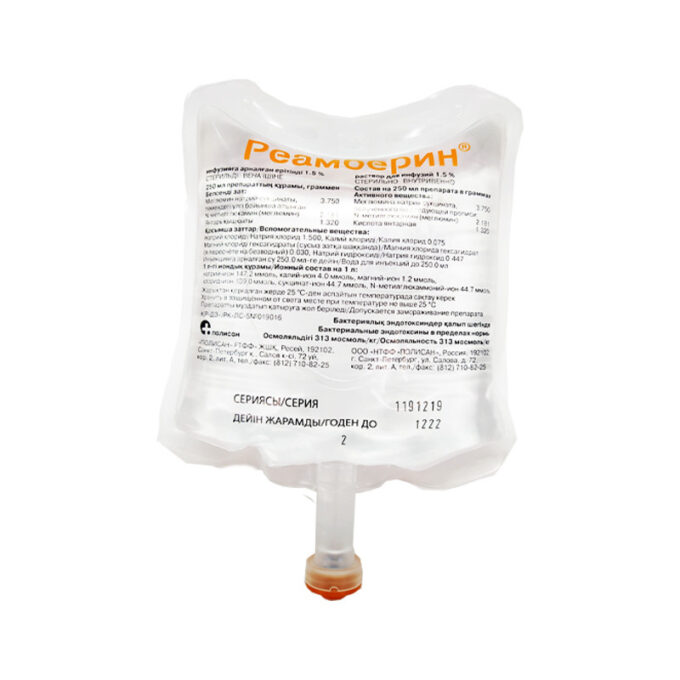 Прозрачная бесцветная жидкость | Состав+1 л раствора содержитнатрия хлорид — 6,00 гкалия хлорид — 0,30 гмагния хлорид — 0,12 гN-(1-дезокси-D-глюцитол-1-ил)-N-метиламмония натрия сукцинат — 15,00 г | Противопоказания+- индивидуальная непереносимость- состояние после черепно-мозговой травмы, сопровождающееся отекомголовного мозга- выраженные нарушения функции почек- беременность и период лактации- детский возраст до 1 года | Побочные действия+при быстром введении- чувство жара- покраснение верхней части тела | Способ применения+Реамберин вводится внутривенно капельно со скоростью не более 90 капель/минуту. Детям с 1 года в суточной дозе 10мл/кг. Взрослым вводить 400-800 мл/сутки. Скорость введения препарата и дозировку определяют в соответствии с состоянием больного. В зависимости от степени тяжести заболевания курс введения препарата от 7 до 11 дней. | Показания к применению+- острые интоксикации различной этиологии у взрослых и детей старше 1года | Объем: 1,5%Артикул: A01-0005781