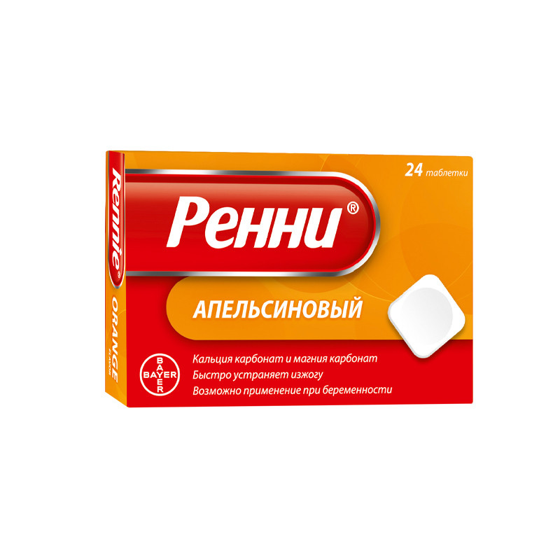Белые с кремоватым оттенком квадратные таблетки с вогнутыми поверхностями и маркировкой «RENNIE» с обеих сторон, с запахом апельсина. | Состав+Одна таблетка содержит:кальция карбонат 680 мг, магния карбоната основного 80 мг | Противопоказания+- повышенная индивидуальная чувствительность к компонентам препарата- выраженные нарушения функции почек- гиперкальцемия- гипермагниемия- детский возраст до 12 лет | Побочные действия+- аллергические реакции- изменение консистенции стула (диарея)- гипермагниемия и гиперкальцемия у больных с почечной недостаточностью. | Способ применения+Взрослым и детям старше 12 лет: по 1-2 таблетки разжевать (или держать во рту до полного рассасывания. При необходимости можно повторить прием препарата через 2 часа.Суточная доза от 4 до 8 таблеток в сутки. В случае более сильной боли, дозировка может быть увеличена.Максимальная суточная доза не более 11 таблеток в сутки. | Показания к применению+Для устранения симптомов, вызываемых повышенной кислотностью желудочного сока:- изжоги- чувства переполнения или тяжести в эпигастральной области- метеоризма- тошноты- кислой отрыжки.После погрешностей в диете, приема лекарств и злоупотребления алкоголем, кофе, никотином. | Объем: Таблетки жевательныеАртикул: A01-0001201