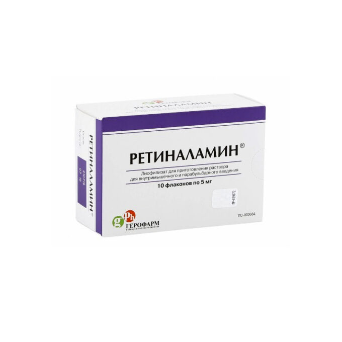 Лиофилизированный порошок или пористая масса белого или белого с желтоватым оттенком цвета | Состав+ретиналамин 5 мг | Противопоказания+- индивидуальная повышенная чувствительность к компонентам препарата- беременность | Побочные действия+- аллергические реакции вследствие индивидуальной непереносимости компонентов препарата | Способ применения+Парабульбарно или внутримышечно по 5-10 мг (растворяя в 1-2 мл 0,5% раствора прокаина, воды для инъекций или 0,9% раствора натрия хлорида) 1 раз в сутки.Курс лечения — 5-10 дней; при необходимости повторяют через 3-6 мес. | Показания к применению+- компенсированная первичная открытоугольная глаукома- диабетическая ретинопатия- посттравматическая и поствоспалительная центральная дистрофия сетчатки- центральная и периферическая тапеторетинальная абиотрофия | Объем: 5 мгАртикул: A02-0023428