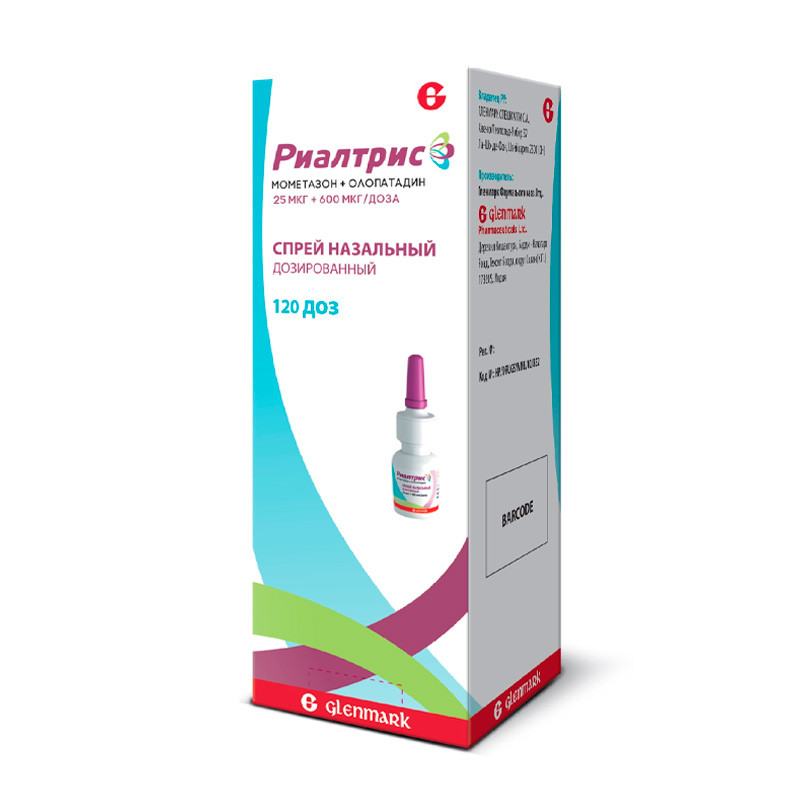 Белая гомогенная суспензия без комков. | Состав+1 доза препарата (1 впрыск) содержитмометазона фуроата моногидрат микронизированный,(эквивалентно мометазона фуроату), 25.0 мкг; олопатадина гидрохлорид (эквивалентно олопатадину), 665.0 мкг (600 мкг) | Противопоказания+- Гиперчувствительность к действующим веществам или к любому из вспомогательных веществ- нелеченные грибковые, бактериальные или туберкулезные инфекции дыхательных путей- детский возраст до 6 летНеобходимые меры предосторожности при примененииЛокальные назальные эффектыРиалтрис не должен применяться при наличии нелеченной локализованной инфекции с поражением слизистой оболочки носа.Из-за ингибирующего воздействия кортикостероидов на заживление ран, пациенты, которые недавно перенесли хирургическое вмешательство на носу или травму носа, не должны применять препарат Риалтрис до полного выздоровления.Сообщалось о случаях изъязвления слизистой полости носа и перфорации носовой перегородки у пациентов после интраназального применения антигистаминных препаратов. После применения интраназальных аэрозольных кортикостероидов очень редко сообщалось о случаях перфорации носовой перегородки.Как и при любом длительном лечении, пациентов, использующих препарат Риалтрис в течение нескольких месяцев или дольше, следует периодически обследовать на предмет возможных изменений со стороны слизистой оболочки носа. Если развивается локализованная грибковая инфекция носа или глотки, может потребоваться прекращение терапии назальным спреем Риалтрис или назначение соответствующего лечения. Сохранение раздражения носоглотки может быть показанием для прекращения приема препарата Риалтрис.Нарушение зренияПосле применения интраназальных аэрозольных кортикостероидов очень редко сообщалось о случаях повышения внутриглазного давления.Нарушение зрения может наблюдаться при системном и местном (в том числе интраназальном, ингаляционном и внутриглазном) применении кортикостероидов. Если у пациента появляются такие симптомы, как нечеткость зрения или другие нарушения зрения, следует рассмотреть возможность направления пациента к офтальмологу для оценки возможных причин нарушений зрения, которые могут включать катаракту, глаукому или редкие заболевания, такие как центральная серозная хориоретинопатия (CSCR), о которых сообщалось после применения системных и местных кортикостероидов. | Побочные действия+Часто (больше или равно 1/100, ‹ 1/10)- дисгевзия (неприятный вкус)- носовое кровотечение, дискомфорт в носовой полостиНечасто (больше или равно 1/1 000, ‹ 1/100)- головокружение, головная боль, сонливость- сухость в носовой полости- сухость во рту, боль в животе, тошнота- слабостьРедко (больше или равно 1/10 000, ‹ 1/1000)- бактериальный вагиноз- тревожность, депрессия, бессонница- летаргия, мигрень- нарушение зрения, синдром сухого глаза, дискомфорт в глазах- боль в ухе- воспаление в носовой полости, нарушения со стороны слизистой носовой полости, боль в ротоглотке, чихание, першение в горле- запор, Боль в области языка- рваная ранаНеизвестно- катаракта, глаукома, повышенное внутриглазное давлениеПри возникновении нежелательных лекарственных реакций обращаться к медицинскому работнику, фармацевтическому работнику или напрямую в информационную базу данных по нежелательным ре