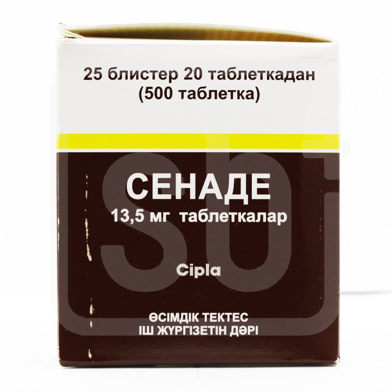 Коричневые или темно-коричневые плоские круглые таблетки со скошенными краями. На одной стороне выдавлено слово «CIPLA», на другой линия разлома | Состав+Одна таблетка содержитсенны листьев экстракт………………….. 93,33 мг(с содержанием суммы кальциевых солей сеннозидов А и В в пересчете на сеннозид В — 13,5 мг) | Противопоказания+- повышенная чувствительность к компонентам препарата- спастический запор, кишечная непроходимость, боли в животе неясного генеза- ущемленная грыжа- острые воспалительные заболевания брюшной полости, перитонит- желудочно-кишечные кровотечения- маточные кровотечения- цистит- нарушения водно-электролитного обмена- детский возраст до 6 лет. | Побочные действия+- возможны: коликообразные боли в животе, метеоризм- потеря с калом электролитов, в основном калия и нарушение водно-электролитного обмена, альбуминурия, гематурия, отложение меланина в слизистой оболочке кишечника, тошнота, рвота, диарея, обесцвечивание мочи, кожная сыпь, судороги, сосудистый коллапс (при длительном применении, особенно в высоких дозах). | Способ применения+Принимают внутрь обычно 1 раз в сутки вечером перед сном,Взрослые и дети старше 12 лет: по 1 таблетке на прием перед сном, запивая водой или каким-либо напитком. При отсутствии эффекта дозу можно увеличить до 2 — 3 таблеток.Дети 6-12 лет: по ? таблетки перед сном, при необходимости дозу увеличивают до 1-2 таблеток.В процессе подбора одну и ту же дозу следует принимать в течение нескольких дней и постепенно увеличивать ее на ? таблетки. Если после достижения максимальной дозы в течение 3 дней дефекация не происходит, необходимо обратиться к врачу. | Показания к применению+- функциональные запоры- регулирование стула при геморрое, проктите, анальных трещинах- подготовка к рентгенологическим исследованиям. | МНН: Сеннозиды А+ВОбъем: 13.5 мгАртикул: A02-0000090