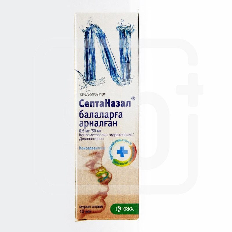 Прозрачная бесцветная жидкость | Состав+1 мл препарата содержитксилометазолин гидрохлорид 0,5 мг,декспантенол 50 мг | Противопоказания+- повышенная чувствительность к активным веществам или другим- компонентам препарата- сухой ринит (rhinitis sicca)- транссфеноидальная гипофизэктомия в анамнезе или другие хирургические вмешательства, воздействующие на твердую мозговую оболочку- Септаназал® для взрослых противопоказан детям до 6 лет- Септаназал® для детей противопоказан детям до 2 лет | Побочные действия+Нечасто (больше или равно 1/1,000, до ‹ 1/100):- реакции повышенной чувствительности (отек Квинке, кожная сыпь, зуд)Редко (больше или равно 1/10,000, до ‹ 1/1,000):- тахикардия, артериальная гипертензияОчень редко (‹ 1/10,000):- беспокойство, бессонница, усталость (сонливость, седативный эффект),головная боль, галлюцинации (особенно у детей)- аритмия- повторная заложенность, носовое кровотечение- судороги (особенно у детей)Не известно (не может быть оценено по имеющимся данным):- жжение или сухость слизистой носа, чихание | Способ применения+ДозировкаОбычная доза препарата Септаназал® для взрослых составляет одно впрыскивание в каждую ноздрю до 3-х раз в день, по мере необходимости.Дозировка зависит от индивидуальной чувствительности к препарату и клинической эффективности.Продолжительность лечения не более 7 дней. Повторное применение возможно только после перерыва в несколько дней.ДетямУ детей в возрасте до 12 лет препарат следует применять под присмотром взрослых.Если по истечении 3-х дней лечения улучшение не наступило или наблюдается ухудшение симптомов, клиническая должна быть пересмотрена.Детям в возрасте старше 6 летОбычная доза препарата Септаназал® для взрослых у детей в возрасте от 6 лет и старше составляет одно впрыскивание в каждую ноздрю до 3-х раз в день. Касательно продолжительности лечения у детей, необходимо всегда консультироваться с врачом.Применение препарата Септаназал® для взрослых противопоказано детям в возрасте до 6 лет.Детям в возрасте от 2 до 6 летОбычная доза препарата Септаназал® для детей у детей в возрасте от 2 до 6 лет составляет одно впрыскивание в каждую ноздрю до 3-х раз в день. Касательно продолжительности лечения у детей, необходимо всегда консультироваться с врачом.Применение препарата Септаназал® для детей противопоказано детям в возрасте до 2 лет.Способ примененияСначала необходимо снять защитную крышку с распылителяПеред первым применением или, если спрей не использовался в течение длительного периода времени, необходимо несколько раз надавить на распылительную головку, пока не появятся мелкие капли.Наконечник распылителя следует ввести, по возможности, вертикально в одну ноздрю и один раз надавить на головку распылителя. Пациенту во время распыления необходимо мягко вдохнуть через нос. При необходимости процедуру следует повторить для другой ноздри.После каждого применения наконечник распылителя следует протирать бумажной салфеткой и крышку обратно вставить на распылитель | Показания к применению+Септаназал® для взрослых/ Септаназал® для детей показан:- для уменьшения отека слизистой оболочки носа при ринитах ив качестве поддерживающей терапии для заживления поврежденийслизистой оболочки носа,- для облегчения симптомов вазомоторного ринита,- для лечения нарушений носового дыхания после хи