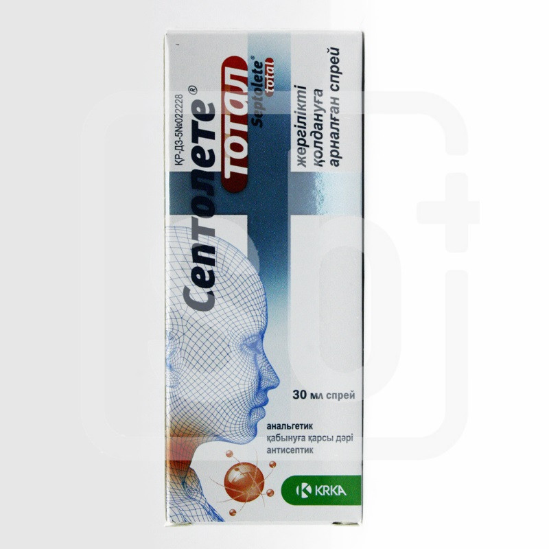 Прозрачная, от бесцветного до желтоватого цвета жидкость | Состав+1 мл препарата содержитбензидамина гидрохлорид 1,5 мг,цетилпиридиния хлорид 5 мг (в виде цетилпиридиния хлорида моногидрата) | Противопоказания+- повышенная чувствительность к активным веществам или к любому вспомогательному веществу- детский возраст до 6 лет | Побочные действия+Редко (больше или равно 1/10 000 до ‹1/1 000):- реакции повышенной чувствительности- бронхоспазм- крапивница, светочувствительностьОчень редко( ‹1/10 000):- раздражение слизистой оболочки полости рта, чувство жжения в полости ртаНеизвестно (не может быть оценено на основе имеющихся данных):- жжение и/или онемение слизистой оболочки полости рта | Способ применения+Взрослым и детям старше 12 лет: для применения разовой дозы, распылительная головка должна быть нажата один — два раза. Процедуру можно повторять через каждые 2 часа, 3-5 раз в день.Для достижения оптимального эффекта, не рекомендуется использовать препарат непосредственно до или после чистки зубов.Не следует превышать рекомендуемую дозу. Септолете® тотал, спрей для местного применения, можно использовать в течение 7 дней.Пациентам пожилого возраста: рекомендуемая доза такая же, как и для взрослых пациентов.Детям от 6 до 12 лет: для применения разовой дозы, распылительная головка должна быть нажата один раз. Процедуру можно повторять через каждые 2 часа, 3-5 раз в день. При использовании спрея дети должны быть под присмотром взрослых.Детям до 6 лет: противопоказано (См. раздел «Противопоказания»).Способ примененияПеред первым применением необходимо несколько раз надавить на распылительную головку, пока не появятся мелкие капли.Если распылитель не используется в течение длительного периода времени (например, по крайней мере, в течение одной недели), нажмите распылительную головку один раз, чтобы появились мелкие капли.Перед использованием снимите пластиковую крышкуОткройте широко рот, направьте форсунку к горлу и нажмите распылительную головку 1-2 раза. Задержите дыхание во время распыления.После каждого использования, закройте пластиковой крышкой распылительную головку.При однократном нажатии извлекается 0,1 мг спрея, в котором содержится 0,15 мг бензидамина гидрохлорида и 0,5 мг цетилпиридиния хлорида. | Показания к применению+Септолете® тотал, спрей показан взрослым и детям старше 6 лет для противовоспалительного, обезболивающего и антисептического лечения раздражений в горле, полости рта и десен, при гингивите, фарингите, ларингите и тонзиллите, а также до и после удаления зубов. | Объем: Спрей для местного примененияАртикул: A01-0004593
