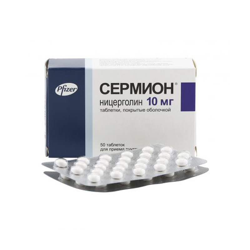 Таблетки 5 мг: круглые, выпуклые таблетки, покрытые оболочкой, оранжевого цвета.Таблетки 10 мг: круглые, выпуклые таблетки, покрытые оболочкой, белого цвета.Таблетки 30 мг: круглые, двояковыпуклые таблетки, покрытые непрозрачной оболочкой желтого цвета. | Состав+ницерголин 5мг, 10мг или 30мг соответственно | Противопоказания+- недавно перенесенный инфаркт миокарда- острое кровотечение- выраженная брадикардия- нарушение ортостатической регуляции- повышенная чувствительность к ницерголину или другим компонентам препарата.С осторожностьюГиперурикемия или подагра в анамнезе и/или в сочетании с лекарственными средствами, которые нарушают метаболизм или выведение мочевой кислоты. | Побочные действия+- редко: выраженное снижение артериального давления (АД), в основном после парентерального введения- головокружение- диспептические явления- ощущение жара- кожные высыпания- сонливость или бессонница- возможно повышение концентрации мочевой кислоты в крови, причем этот эффект не зависит от дозы и длительности терапии.Побочные эффекты обычно легко или умеренно выражены. | Способ применения+Таблетки 5 мг, 10 мг и 30 мгВнутрь: 5 — 10 мг три раза в сутки с одинаковыми интервалами между приемами в течение длительного периода времени (не более 3-х месяцев). При сосудистой деменции показано применение 30 мг 2 раза в сутки (при этом каждые 6 месяцев рекомендуется консультироваться с врачом о целесообразности продолжения терапии).Лиофилизат для приготовления раствора для инъекцийВнутримышечно: 2 — 4 мг (2 — 4 мл) два раза в сутки.Внутривенно: медленная инфузия 4 — 8 мг в 100 мл 0,9 % раствора натрия хлорида или раствора декстрозы 5% -10%; по назначению врача эту дозу можно вводить несколько раз в день.Внутриартериально: 4 мг в 10 мл 0,9 % раствора натрия хлорида; препарат вводят в течение 2 минут.Восстановленный раствор рекомендуется использовать сразу после приготовления. Доза, длительность терапии и способ введения зависят от характера заболевания и назначаются врачом. В некоторых случаях предпочтительно начать терапию с парентерального введения, а затем перейти на прием препарата внутрь для поддерживающего лечения.Больным с нарушением функции почек (сывороточный креатинин › 2 мг/дл) Сермион® рекомендуется применять в более низких терапевтических дозах. | Показания к применению+- острые и хронические церебральные метаболические и сосудистые нарушения(вследствие атеросклероза, артериальной гипертензии, тромбоза или эмболиисосудов головного мозга, в том числе транзиторная церебральная атака,сосудистая деменция и головная боль, вызванная вазоспазмом);- острые и хронические периферические метаболические и сосудистые нарушения(органические и функциональные артериопатии конечностей, болезнь Рейно,синдромы, обусловленные нарушением периферического кровотока);- в качестве дополнительного средства при лечении гипертонических кризов(парентерально). | МНН: НицерголинОбъем: