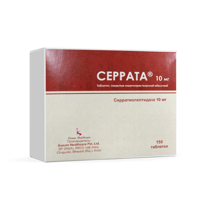 Круглая, двояковыпуклая таблетка, покрытая кишечнорастворимой оболочкой белого цвета. | Состав+Одна таблетка содержитсерратиопептидаза 10 мг | Противопоказания+- повышенная чувствительность к компонентам препарата- беременность и период лактации-детский и подростковый возраст до 18 лет | Побочные действия+Редко- тошнота- рвота- анорексия- дискомфорт в эпигастрии- диареяОчень редко- носовое кровотечение- мокрота с примесью крови | Способ применения+Препарат назначают в составе комплексной терапии в дозе 10 мг (1 таблетка) 2-3 раза в сутки независимо от приема пищи. Таблетки следует глотать не разжевывая, запивая 1 стаканом воды. Максимальная разовая доза — 10мг.Максимальная суточная доза — 30мг.Длительность курса лечения составляет 1-4 недели и зависит от характера и динамики патологического процесса. | Показания к применению+В комплексной терапии- заболевания верхних дыхательных путей (для снижения вязкости мокроты и повышения всасывания антибиотиков)- заболевания ЛОР — органов- дерматит с болевым синдромом- мастит (для рассасывания гематом, уменьшения отека)- травмы: спортивные повреждения, растяжения и разрывы связок, переломы и вывихи (для уменьшения отека и восстановления микроциркуляции в месте повреждения)-послеоперационный период (с целью профилактики и лечения инфекционных осложнений и риска развития спаечных процессов, для уменьшения отеков)-трансплантация тканей и органов (для профилактики отторжения трансплантата и восстановления микроциркуляции в месте отторжения его) | Объем: