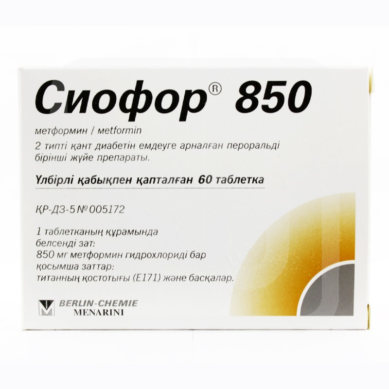 Белые продолговатые таблетки, покрытые оболочкой, с двусторонней насечкой для деления | Состав+Одна таблетка, покрытая оболочкой содержитметформина гидрохлорид 850 мг | Противопоказания+- повышенная чувствительность к метформину или другим компонентам препарата- диабетический кетоацидоз, диабетическая прекома- выраженные нарушения функции печени и почек- инфаркт миокарда- сердечно-сосудистая недостаточность- дыхательная недостаточность и гипоксические состояния- диабетическая ретинопатия- опухолевые заболевания- алкоголизм- анемия- беременность и лактация- детский возраст до 12 лет. | Побочные действия+- очень часто (›10 %): тошнота, рвота, понос, боли в животе, потеря аппетита. Появляются в начале лечения и в большинстве случаев проходят самостоятельно. Чтобы избежать появления данных симптомов рекомендуют принимать метформин во время или после еды в 2 или 3 приема. Прекращения лечения при этом обычно не требуется, поскольку в большинстве случаев эти симптомы исчезают даже при неизмененной дозировке.- часто (1%-10%): металлический привкус во рту- очень редко (‹ 0,01 %): легкая эритема у пациентов, страдающих повышенной чувствительностью, снижение всасывания в кишечнике витамина В12, а также при длительном лечении — понижение его концентрации в сыворотке, лактатацидоз (0,03 случая/1000 пациентов в год). | Способ применения+Дозировка препарата Сиофор® 850 и длительность применения устанавливается врачом для каждого пациента индивидуально, в зависимости от уровня сахара в крови и моче.Терапию рекомендуют проводить с постепенным увеличением доз, начиная с 1/2-1 таблеток Сиофора® 850 в сутки (что соответствует 0,425 г — 0,850 г метформина гидрохлорида). Затем, в зависимости от уровня глюкозы в крови, дозу препарата увеличивают с интревалом в одну неделю до средней суточной дозы — от одной до трех таблеток Сиофора® 850 в сутки (что соответствует от 0,850 г до максимально 2,550 г метформина гидрохлорида в сутки).Максимальная разовая доза составляет 1 таблетку Сиофора® 850 (0,850 г метформина гидрохлорида).Обычно суточные дозы, составляющие две таблетки Сиофора® 850 в сутки, являются достаточными. При дозах, превышающих 3 таблетки Сиофора® 850 в сутки, дальнейшего повышения эффективности, как правило, не достигается.Таблетки, покрытые оболочкой, принимают, не разжевывая и запивая жидкостью (например, стаканом воды), во время приема пищи. Если необходимая суточная доза составляет более одной таблетки, то ее следует распределить на 2 или 3 приема во время еды. | Показания к применению+- инсулиннезависимый сахарный диабет (диабет 2-го типа) в случае неэффективности диетотерапии, в особенности, при избыточном весе.Сиофор® 850 можно применять как в виде монотерапии, так и в комбинации с другими пероральными противодиабетическими средствами или инсулином. | МНН: МетформинОбъем: 850 мгАртикул: A01-0001285