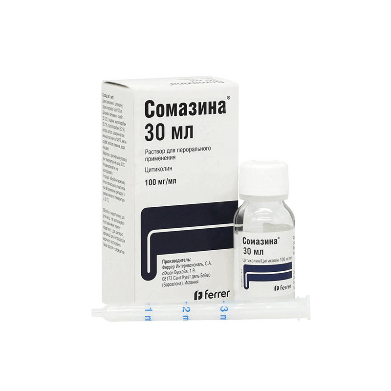 Прозрачный раствор светло-розового цвета | Состав+1 мл раствора (20 капель) содержитцитиколин 100мг | Противопоказания+- аллергия на один из компонентов препарата- пациенты с повышенным тонусом парасимпатической нервной системы (блуждающего нерва). | Побочные действия+-очень редко возможны:- тошнота, боль в желудке, диарея.Возможны, но в практике не встречались:-чувство жара-повышение температуры-кратковременные повышение или понижение давления-бессонница-снижение аппетита-незначительные изменения показателей функции печени. | Способ применения+Взрослые: по 200 мг (2мл — 40 капель) 3 раза в сутки;Дети с момента рождения по 100мг (1мл — 20 капель) 2-3 раза в сутки. Длительность лечения зависит от степени тяжести заболевания, но минимальный рекомендуемый курс — 45 дней.Препарат должен применяться с использованием специального шприца для дозирования по следующей схеме:1. опустить во флакон шприц с опущенным поршнем2. набрать необходимое количество раствора, поднимая поршень вверх3. принять препарат, предварительно смешав его с небольшим количеством водыПосле каждого приема рекомендуется промывать шприц водой. | Показания к применению+- Нарушения мозгового кровообращения в остром периоде и периоде реабилитации:- черепно-мозговые травмы и их последствия- когнитивные, сенситивные, моторные и нейропсихологические расстройства, связанные с церебральной патологией дегенеративного или сосудистого происхождения. | МНН: ЦитиколинОбъем: 30млАртикул: A02-0004190
