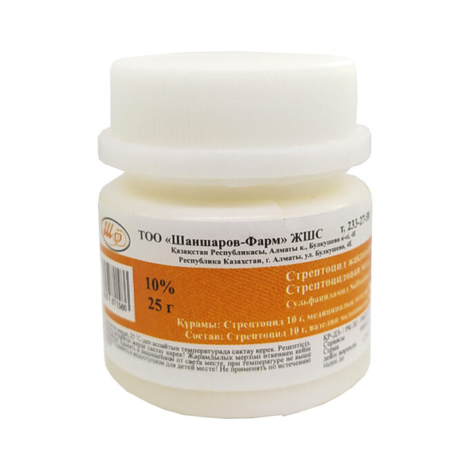 Мазь белого или светло-желтого цвета. | Состав+100 г мази содержитстрептоцид 5 г и 10 г | Противопоказания+- повышенная чувствительность к сульфаниламидам- почечная и печеночная недостаточность- врожденный дефицит глюкозо-6-фосфатдегидрогеназы | Побочные действия+Местные аллергические реакции- зуд- крапивница | Способ применения+Местно, наружно наносят непосредственно на пораженную поверхность или на марлевую салфетку; перевязки производят через 1-2 дня.Продолжительность лечения 7-10 дней. | Показания к применению+- инфицированные раны- ожоги (I и II степени)- фолликулиты- фурункулы- карбункулы- вульгарные угри- импетиго | МНН: СульфаниламидОбъем: