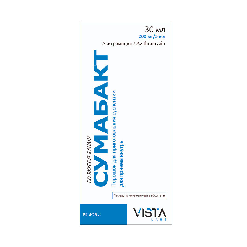 Сыпучий гранулированный порошок от белого до почти белого цвета, который после восстановления образует суспензию от белого до почти белого цвета со вкусом банана. | Состав+5 мл суспензии содержитазитромицина дигидрат 209.64 мг (эквивалентно азитромицину 200 мг) | Противопоказания+- Гиперчувствительность к азитромицину, эритромицину или макролидным и кетолидным антибиотикам, или к любому из вспомогательных веществ- тяжелые нарушения функции печени и почек- лицам с наследственной непереносимостью фруктозы, мальабсорбцией глюкозы-галактозы, дефицитом фермента сукразы-изомальтазы- первый триместр беременности и кормления грудьюНеобходимые меры предосторожности при примененииГиперчувствительностьКак и в случае с эритромицином и другими макролидами, сообщалось о редких тяжелых аллергических реакциях, включая ангионевротический отек и анафилаксию (редко со смертельным исходом), кожные реакции, включая острый генерализованный экзантематозный пустулез (AGEP), синдром Стивенса-Джонсона (SJS), токсический эпидермальный некролиз (TEN) (редко со смертельным исходом) и лекарственную сыпь с эозинофилией и общими симптомами (DRESS).Некоторые из этих реакций на препарат, содержащий азитромицин, имели рецидивы и требовали более продолжительного периода наблюдения и лечения.ГепатотоксичностьПоскольку печень является основным путем выведения азитромицина, его следует применять с осторожностью у пациентов с тяжелой печеночной недостаточностью. Сообщалось о случаях молниеносного гепатита, потенциально приводящего к угрожающей жизни печеночной недостаточности, при применении азитромицина. Некоторые пациенты, возможно, имели ранее существовавшее заболевание печени или, возможно, принимали другие гепатотоксические лекарственные средства.В случае появления признаков и симптомов дисфункции печени, таких как быстро развивающаяся астения, связанная с желтухой, темная моча, склонность к кровотечениям или печеночная энцефалопатия, необходимо немедленно провести функциональные пробы печени/анализы. При развитии дисфункции печени, прием препарата СУМАБАКТ необходимо прекратить и обратиться к врачу.Производные спорыньиУ пациентов, получающих производные спорыньи, появление эрготизма провоцируется одновременным приемом некоторых макролидных антибиотиков. Нет данных, относительно возможности взаимодействия между производными спорыньи и азитромицином, тем не менее, из-за теоретической возможности развития эрготизма, азитромицин и производные спорыньи должны приниматься раздельно.Удлинение интервала QTПри лечении другими макролидами наблюдались пролонгированная сердечная реполяризация и удлинение интервала QT, ведущие к риску развития сердечной аритмии и желудочковой тахикардии типа «пируэт». Подобный эффект азитромицина нельзя полностью исключить у пациентов с повышенным риском длительной реполяризации сердца; поэтому требуется осторожность при лечении пациентов:- при врожденном или приобретенном удлинении интервала QT- у пациентов, принимающих антиаритмические препараты классов IА и III, цизаприд и терфенадин- при нарушении водно-электролитного баланса, особенно в случае гипокалиемии и гипомагниемии- при клинически значимой брадикардии, аритмии сердца или тяжелой сердечной недостаточностиСуперинфекцииКак и при при