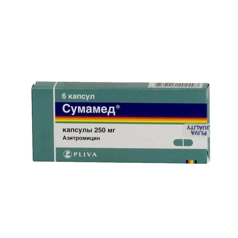 Твердые желатиновые капсулы, голубовато-синей окраски, содержимое капсул — порошок от белого до белого со светло-желтым оттенком цвета. | Состав+Одна капсула содержитазитромицина дигидрат, 250 мг | Противопоказания+- известная повышенная чувствительность к макролидным антибиотикам- тяжелые нарушения функции печени и почек- детский возраст до 12 лет- первый триместр беременности | Побочные действия+Часто (›1/100, ‹ 1/10)- рвота, диарея, боль в животе, тошнотаРедко(›1/1000, ‹ 1/100)- тромоцитопения- агрессивность, возбуждение, беспокойство, нервозность, бессонница- парестезии и астения- обратимое снижение слуха и шум в ушах- аритмии, удлинение интервала QT- потеря аппетита, метеоризм, запор, псевдомембранозный колит- транзиторный подъем уровня аминотрансфераз печени, билирубина,холестатическая желтуха, гепатит- реакции гиперчувствительности (покраснение, кожная сыпь, зуд,ангионевротический отек, фоточувствительность), мультиформная эритема,синдром Стивена-Джонсона и токсический эпидермальный некролиз,анафилактический шок- интерстициальный нефрит, острая почечная недостаточностьОчень редко (›1/10000, ‹ 1/1000)- усталость, головная боль, головокружение, конвульсии- изменение вкуса и обоняния- артралгии- вагиниты, кандидоз, суперинфекции | Способ применения+Взрослые и дети с массой тела более 45 кгСумамед капсулы 250 мг принимают один раз в день за 1 час до еды или через 2 часа после еды.При инфекциях верхних и нижних отделов дыхательных путей, инфекциях кожи и мягких тканей назначают по 500 мг/сутки в течение 3-х дней (курсовая доза — 1,5 мг).При неосложненном уретрите и/или цервиците назначают однократно 1 г (4 капсулы по 250 мг).При болезни Лайма (бореллиозе) для лечения начальной стадии (erythema migrans) назначают по 1 г (4 капсулы по 250 мг) в первый день и по 500 мг ежедневно со 2-го по 5-й день (курсовая доза — 3 г).При заболеваниях желудка и двенадцатиперстной кишки, ассоциированных с Helicobacter pylori, Сумамед назначают по 1 г (4 капсулы по 250 мг) в сутки в течение 3-х дней в составе комбинированной терапии.В случае пропуска приема одной дозы препарата следует пропущенную дозу принять как можно раньше, а последующие — с перерывами в 24 часа. У пожилых лиц и у больных с нарушенной функцией почек нет необходимости менять дозировку.Для лечения детей необходимо применять детские формы Сумамеда: Сумамед 125 мг и Сумамед 100мг/5 мл, Сумамед Форте 200 мг/5 мл. | Показания к применению+- фарингит, тонзиллит, синусит, средний отит- острый и хронический бронхит, интерстициальная и альвеолярная пневмония- хроническая мигрирующая эритема — начальная стадия болезни Лайма, рожа, импетиго, вторичные пиодерматозы- заболевания желудка и 12-перстной кишки, ассоциированные сHelicobacter pylori- гонорейный и негонорейный уретрит и/или цервицит | МНН: АзитромицинОбъем: 250 мгАртикул: A02-0000381