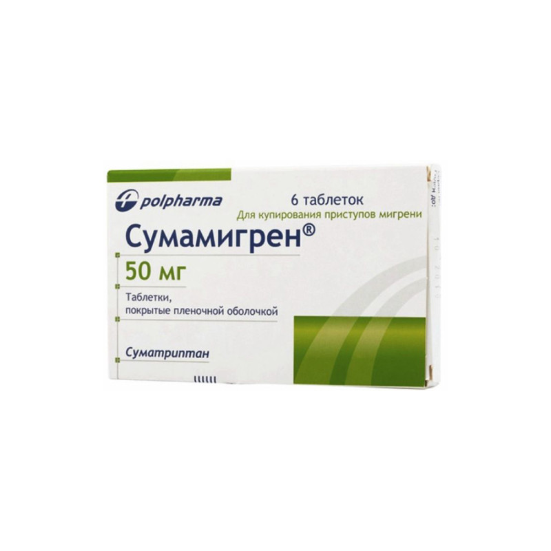 Таблетки, покрытые оболочкой 50 мг, круглые, выпуклые с обеих сторон, розового цветаТаблетки, покрытые оболочкой 100 мг, круглые, выпуклые с обеих сторон, оранжевого цвета | Состав+1 таблеткa содержитсуматриптан 50 мг или 100 мг (в форме сукцината) | Противопоказания+- повышенная чувствительность к суматриптану или другим компонентам препарата- профилактика приступов мигрени- лечение кластерных головных болей (проявляющихся в основном у пациентов преклонного возраста)- ишемическая болезнь сердца (стенокардия, стенокардия Принцметала, состояние после перенесенного инфаркта) и другие заболевания сердечно-сосудистой системы- нарушение мозгового кровообращения (мозговой инсульт, транзиторная ишемия мозга)- заболевания периферических сосудов- неконтролируемая гипертоническая болезнь- одновременное применение с ингибиторами моноаминооксидазы А (Сумамигрен возможно применять по истечении 14 дней после лечения ингибиторами моноаминооксидазы)- одновременное применение с лекарственными средствами, содержащими эрготамин или его производные, как например, дигидроэрготамин и метисергид, или другими лекарственными средствами из группы агонистов рецепторов 5-HT1(Сумамигрен возможно применять по истечении 24 часов после лечения препаратами содержащими эрготамин или его производными)- тяжелая печеночная недостаточность- эпилепсия- дети и подростки до 18 лет. | Побочные действия+Часто- боль и ощущение сдавления в грудной клетке, затылке, гортани, нижней челюсти, удушье- учащенное сердцебиение, обморок, головокружение, падение или повышение артериального давления крови, повышенное потоотделение, усталость, сонливость- синуситы, аллергический ринит, воспаление верхних дыхательных путей, наружный отит, кровотечения из ушей, носа, горла, нарушения слуха, шум в ушах,- повышенная чувствительность к шуму, звукам и освещению- миалгии, парестезии- тошнота, рвота, сухость слизистой ротовой полости- диарея- аллергические реакции.Не очень часто- бледность кожных покровов, периферический цианоз- стенокардия, атеросклероз сосудов, нарушения ритма ( брадикардия, блокады),- ишемия мозга, транзиторное нарушение кровообращения- дегидратация, гастро-эзофагеальный рефлюкс, запоры- мышечное дрожание и спазм- депрессия, нарушение концентрации внимания, нарушение обоняния,эйфория, болезненные ощущения в области лица, ощущение жара, плаксивость, нарушения сна- зуд, сыпь- лихорадка, астма.Редко- заложенность ушей- повышенный уровень ТТГ, лакторея, гипергликемия или гипогликемия, гипотиреоз, полидипсия, увеличение или снижение массы тела, кисты желез внутренней секреции, нарушения обмена электролитов- патологические изменения в склере, расширение зрачка, нарушения зрения, зуд, боль, раздражение и жжение в глазах, нарушения аккомодации, глазная боль, кератит и конъюнктивит-желудочно-кишечные кровотечения, дегтеобразный стул, язвы желудка, желудочные и кишечные боли, зубная боль, гиперсаливация, повышенный аппетит, чувство жжения на губах- агрессивность, апатия, кластерные головные боли, судороги, снижение аппетита, галлюцинации, паралич лица, истерия, нарушения памяти , речи и тембра голоса- чихание, кашель, бронхит- сухость кожи, себорейный дерматит- отеки, гематомы, генерализованное увеличение лимфатических узлов, кровоподтеки.Исключительно редко- анафил